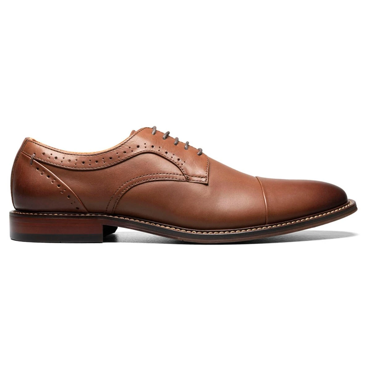A style for every season and every reason, the Mens Stacy Adams Maddox cap toe oxford is a shoe every man should own. Sleek and elegant, the simple cap toe, perforation details, and stacked heel give it a versatile look that is easily dressed up or down.