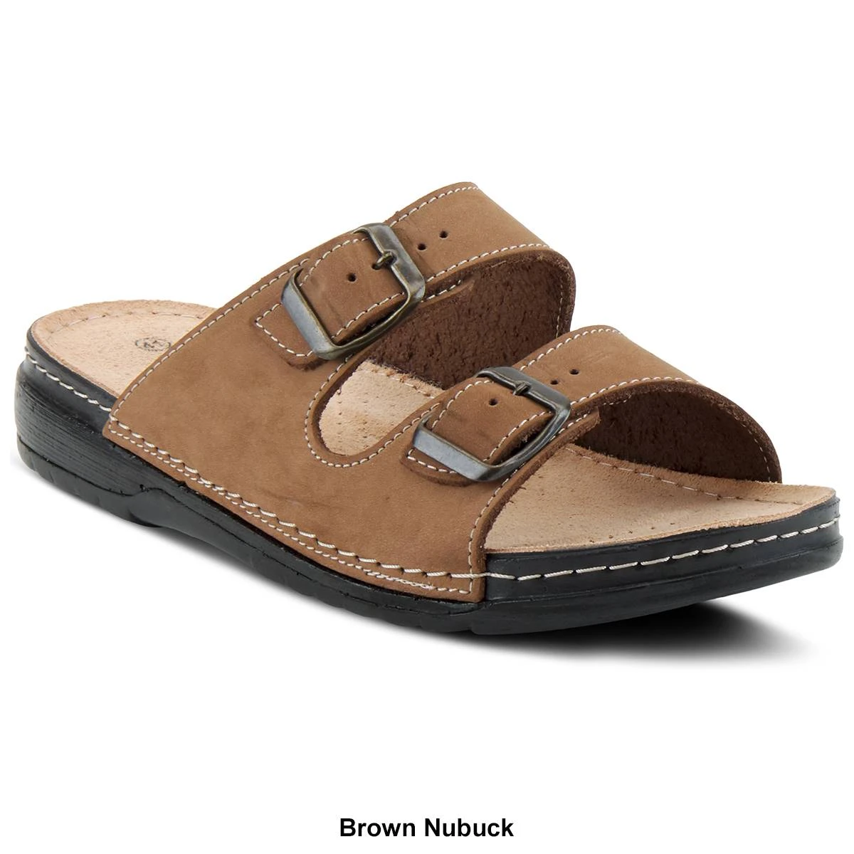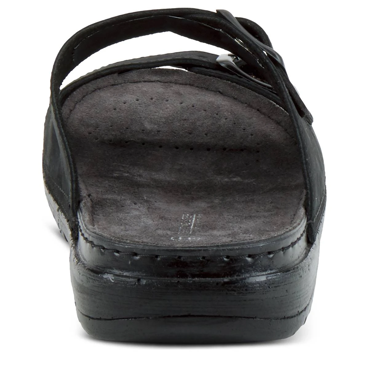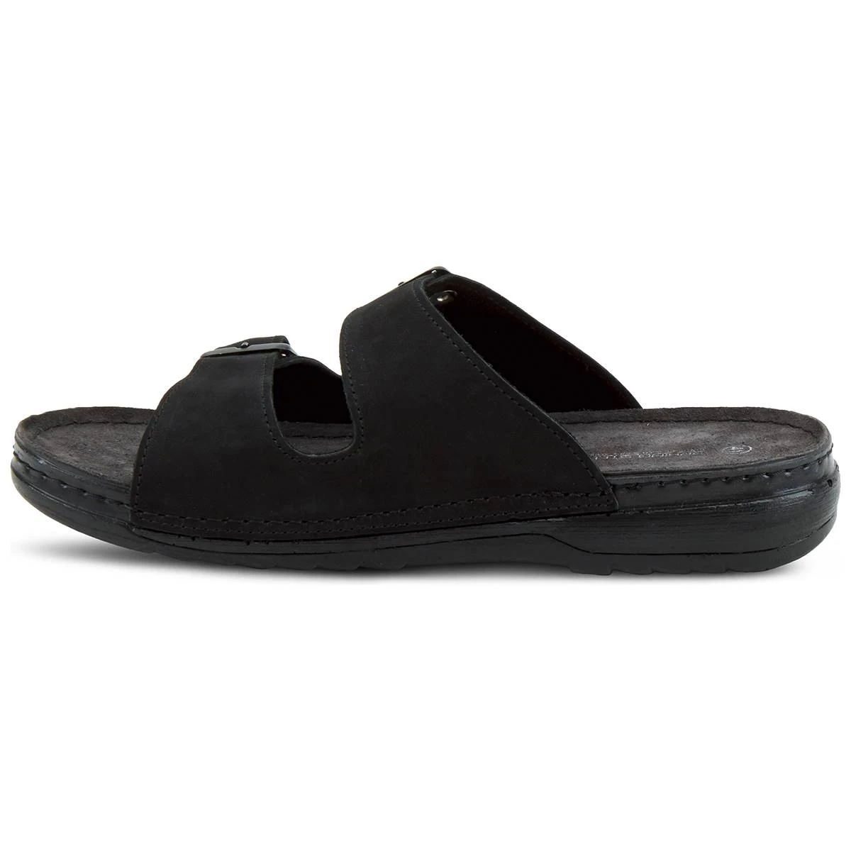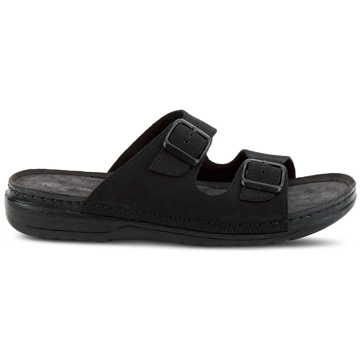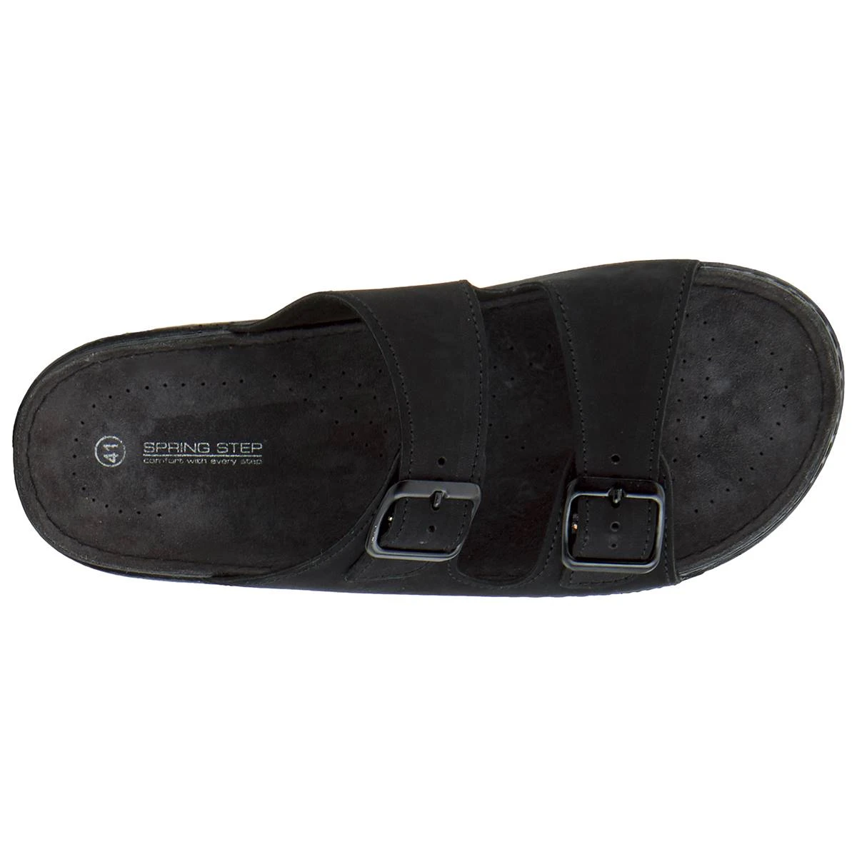The Mens Spring Step Ozzie slide sandals have a leather upper with a PU outsole. These footbed sandals feature a stitch to sole construction with dual buckle straps for adjustability and fit. The covered padded footbed adds to the comfort of this very soft and flexible sandal.