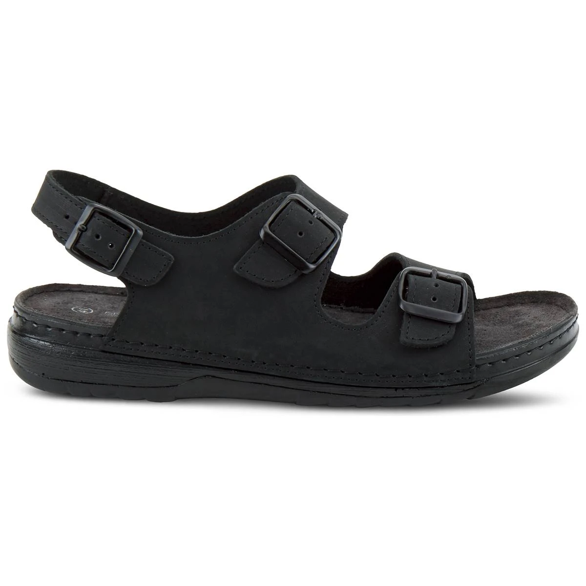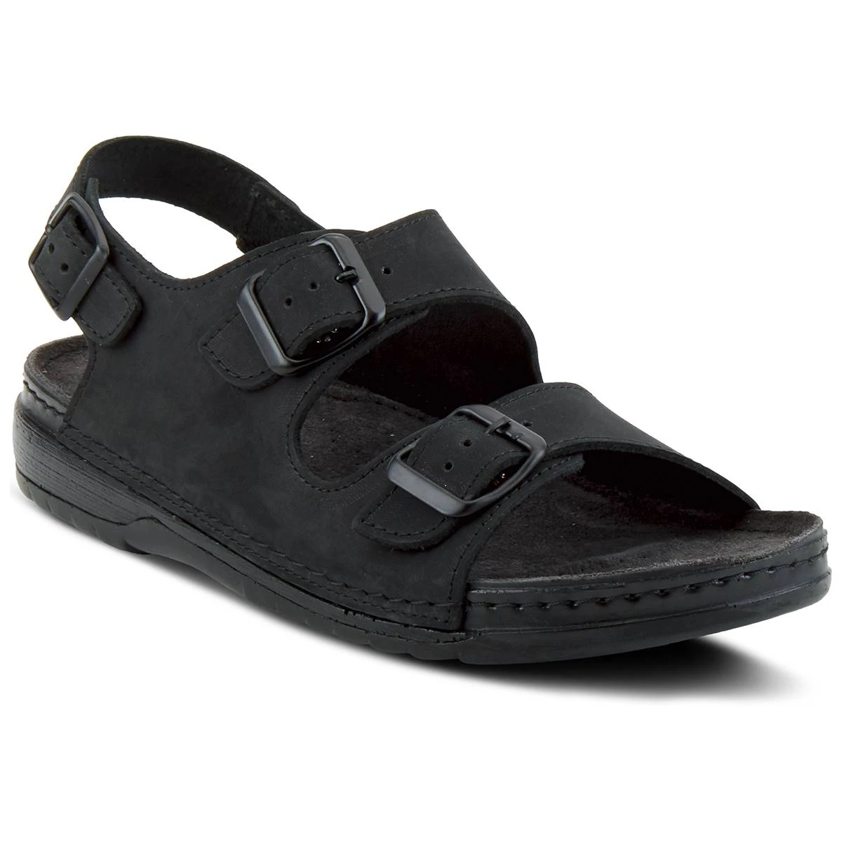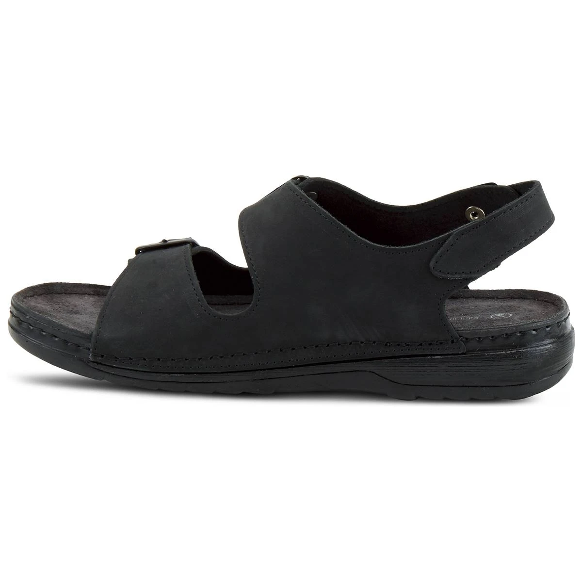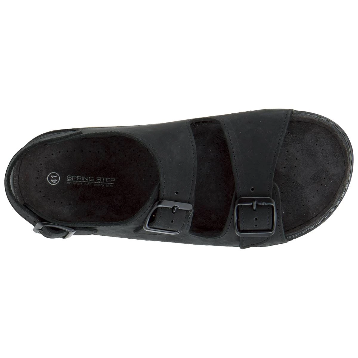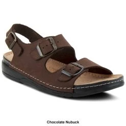 The Mens Spring Step Spiro sandals have a leather upper with a PU outsole. These footbed sandals feature a stitch to sole construction with a back strap and dual buckle straps for adjustability and fit. The leather-covered padded footbed adds to the comfort of this very soft and flexible sandal.