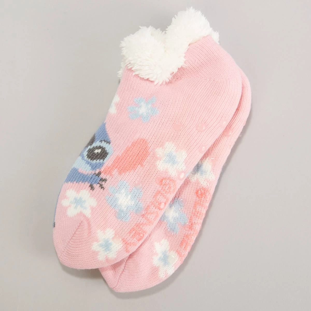 Put on the Womens Disney Lilo & Stitch velour anklet cozy slipper socks for warmth and comfort. Featuring a fun Lilo and Stitch design, faux fur lining, and grippers on the bottom.