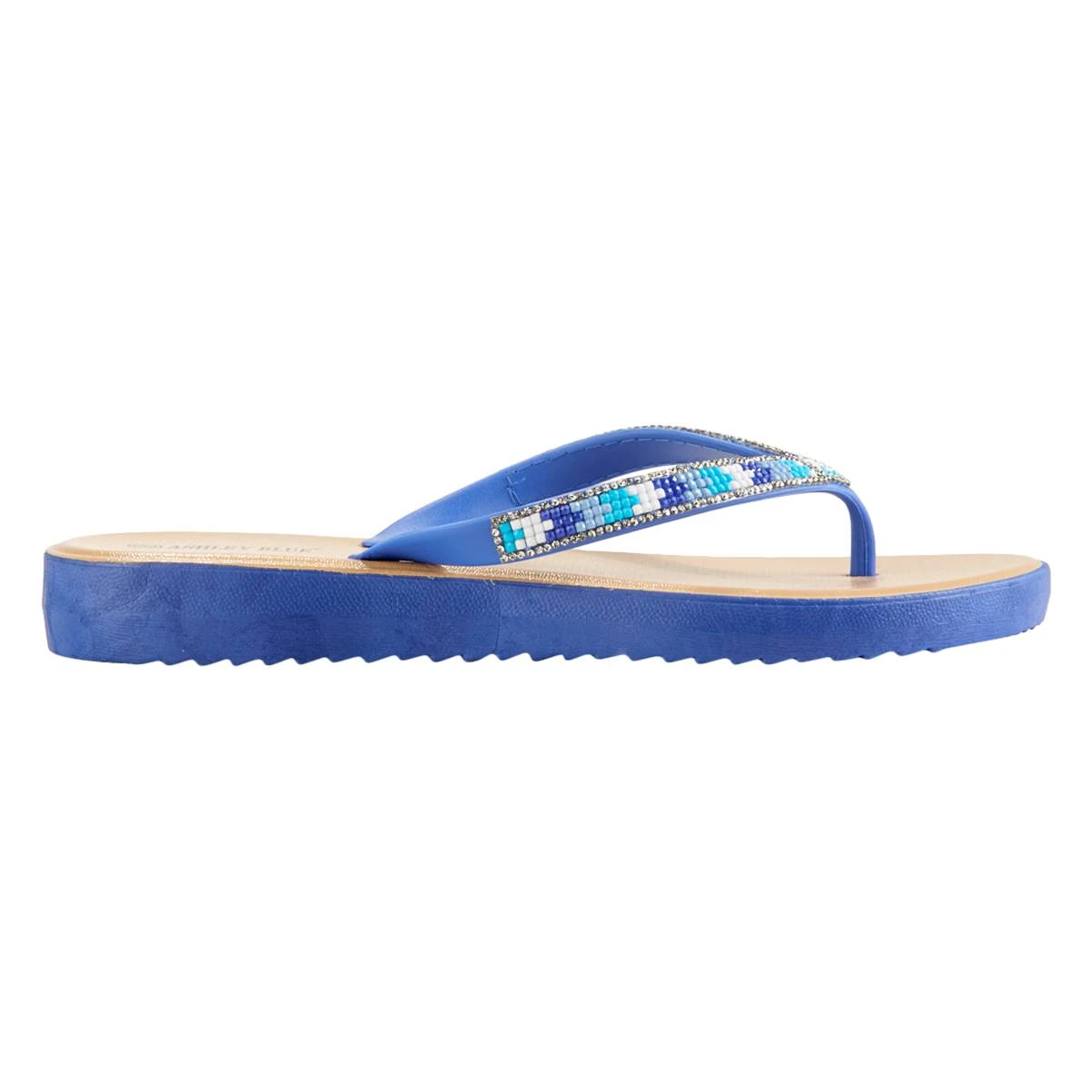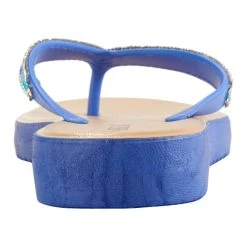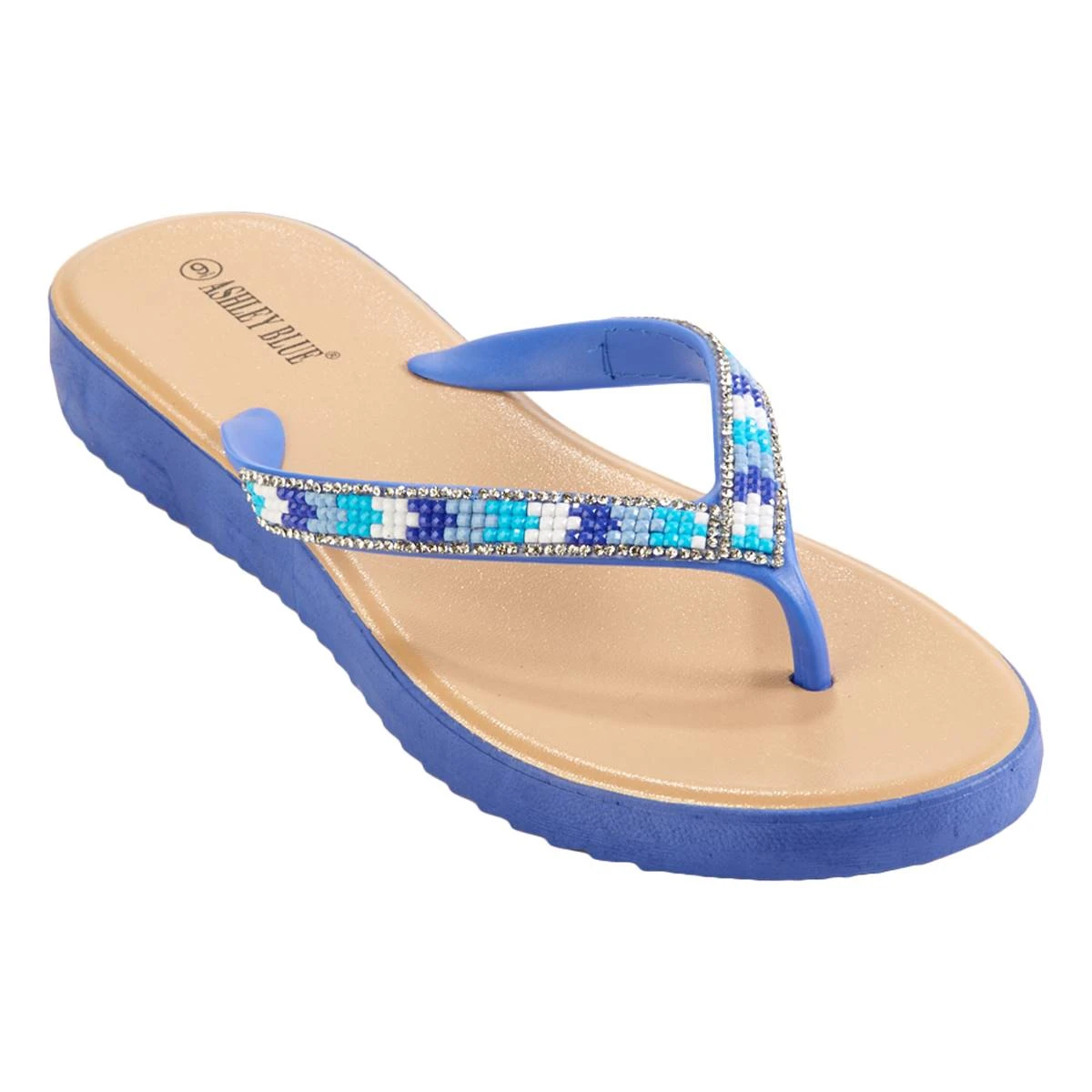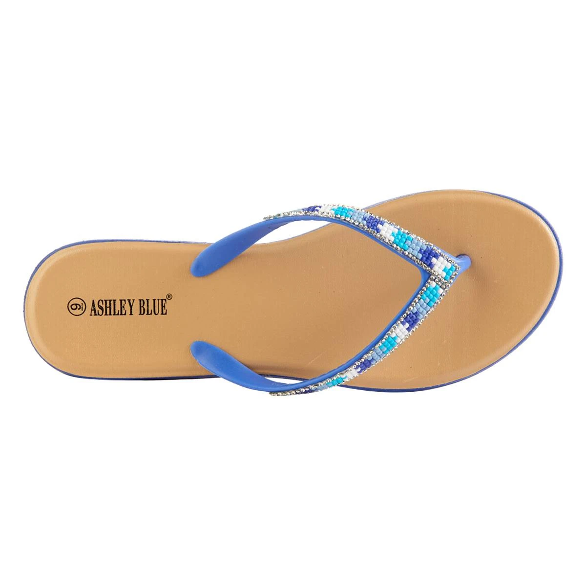 These Womens Ashley Blue beaded rhinestone flip flop sandals are for the fashionable free spirit within us all. From summer to date night, these flat bottom jellies are essential for iconic comfort.