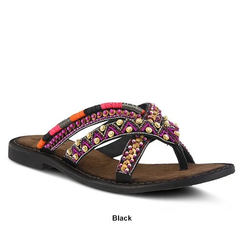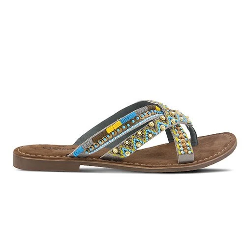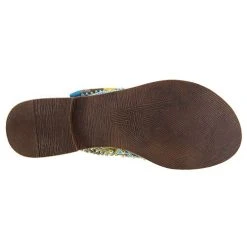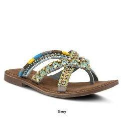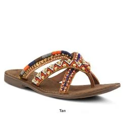 These Womens Azura Style Triage thong sandals feature beaded straps with pearls and bead discs arranged in geometric designs. This sandal displays padded suede insoles, a round toe, leather uppers, tonal leather lining and a rubber outsole.