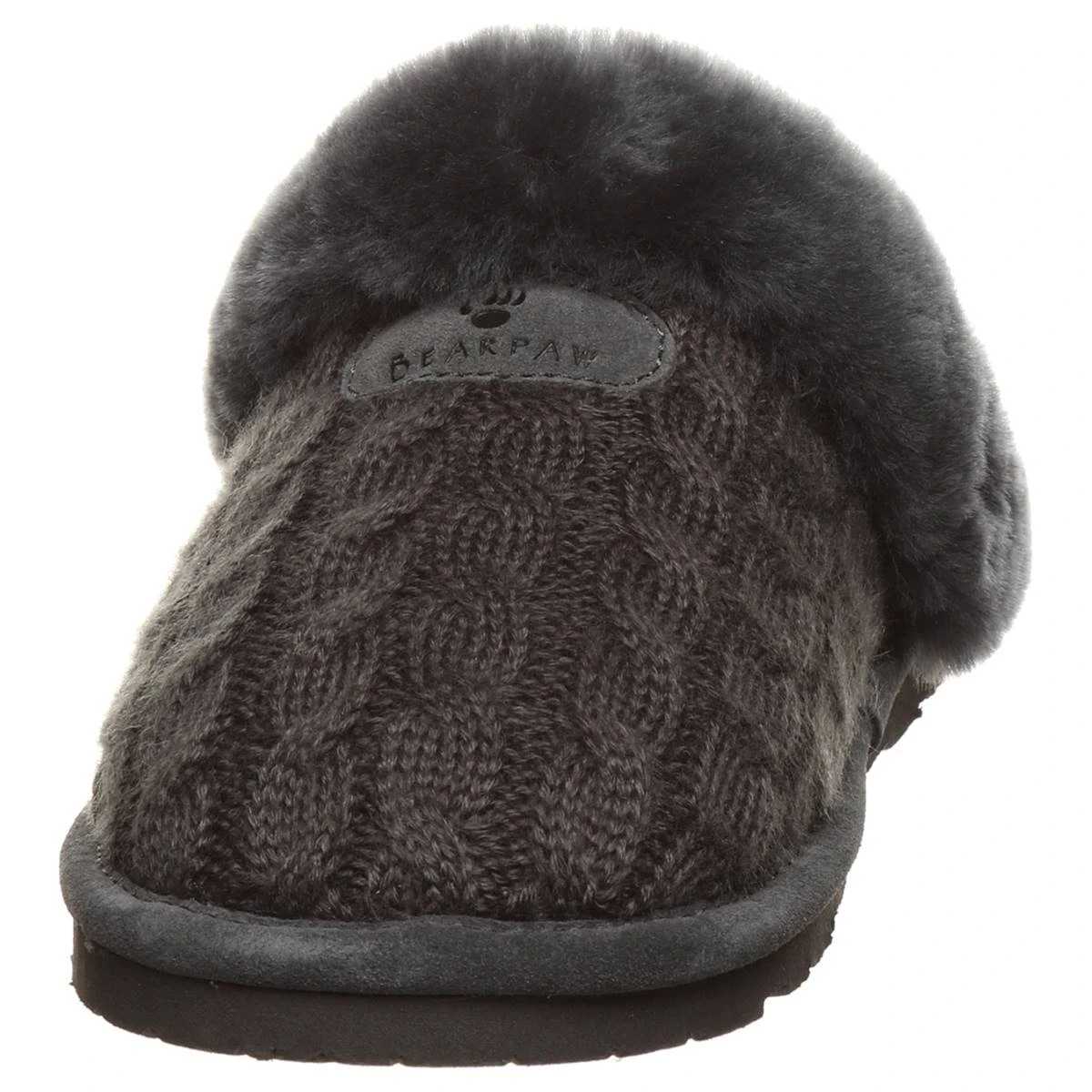 Relax in style with these Womens BEARPAW® Effie slip on slippers. They have the same snuggly sheepskin inside and a cable knit sweater outside creating a winter wonderland for your feet.