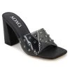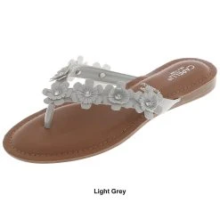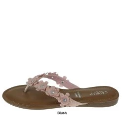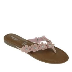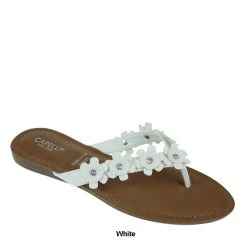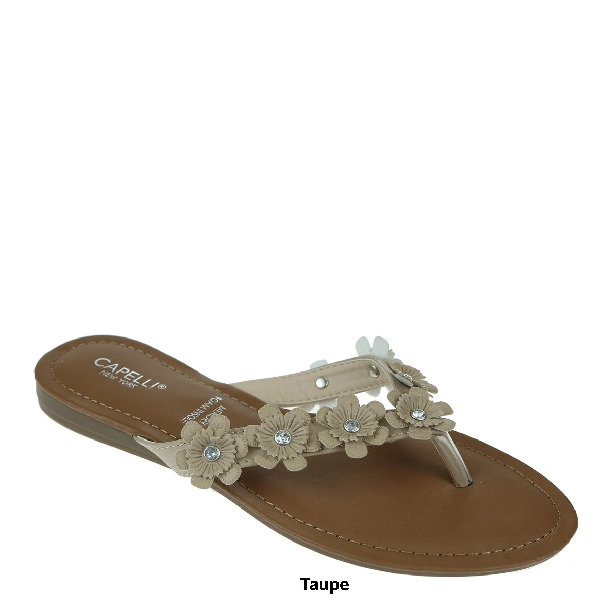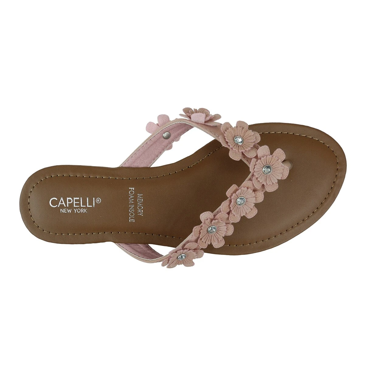 Womens Capelli New York floral flip flop sandals with pearl accents. Faux leather 3D flowers with gem rivet trim on a wrapped faux leather sock with memory foam and mini wedge TPR outsole.