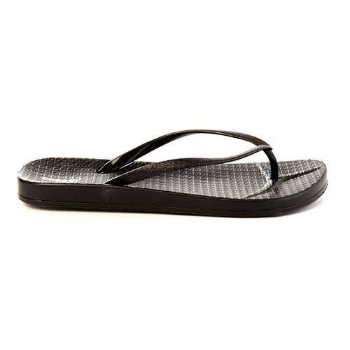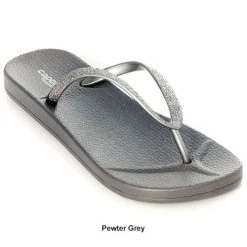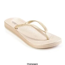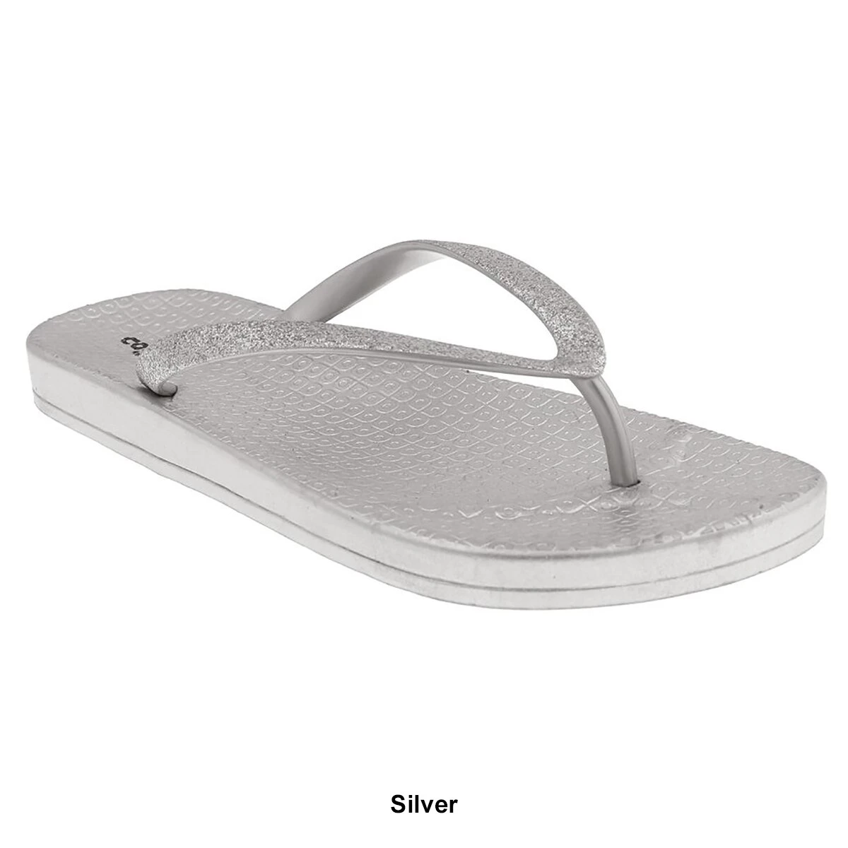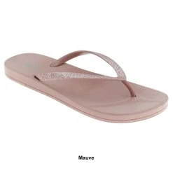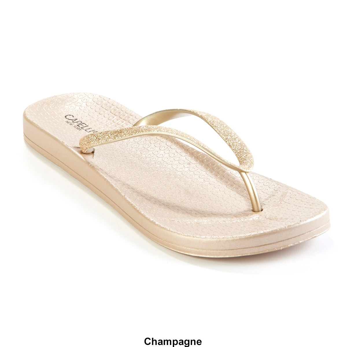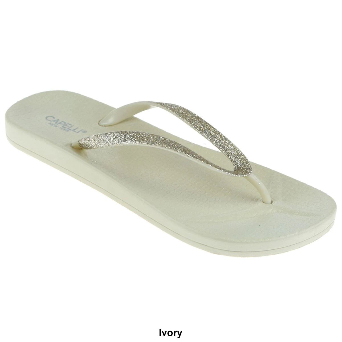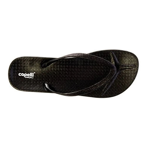 These Womens Capelli New York glitter opaque jelly flip flop sandals are a faux-leather design on a molded injected flexy fit body. They feature plastic uppers and outsoles.