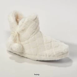 Cozy up with the Womens Capelli New York quilted faux fur boot slippers and relax in comfort. These indoor slippers feature a tie with poms and faux fur lining on a fabric-covered TPR outsole.