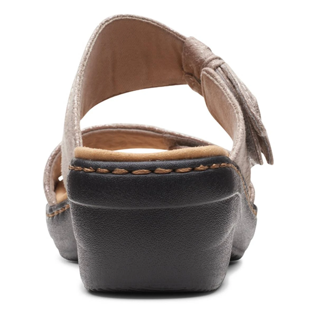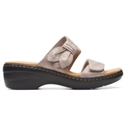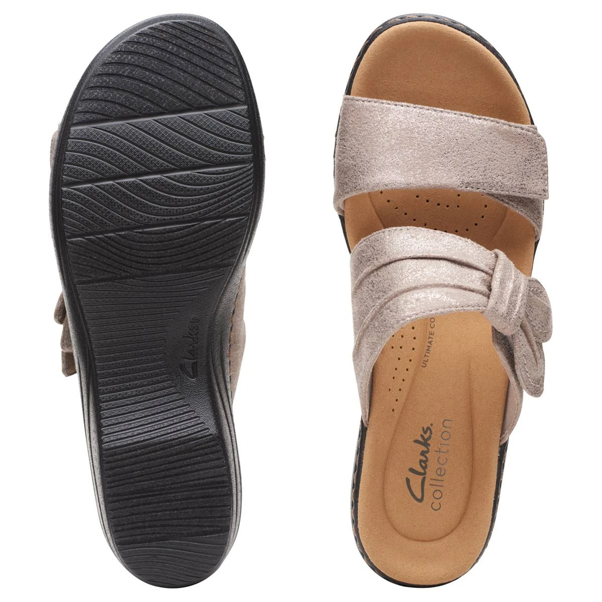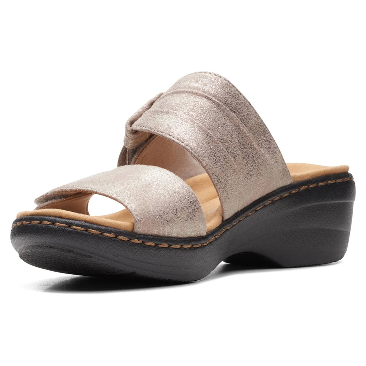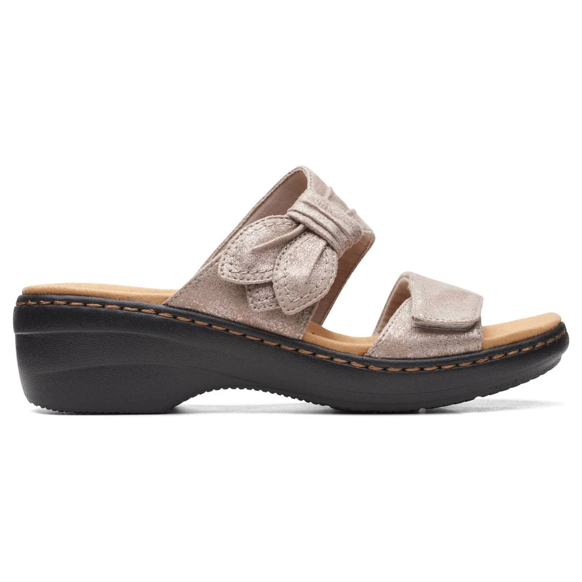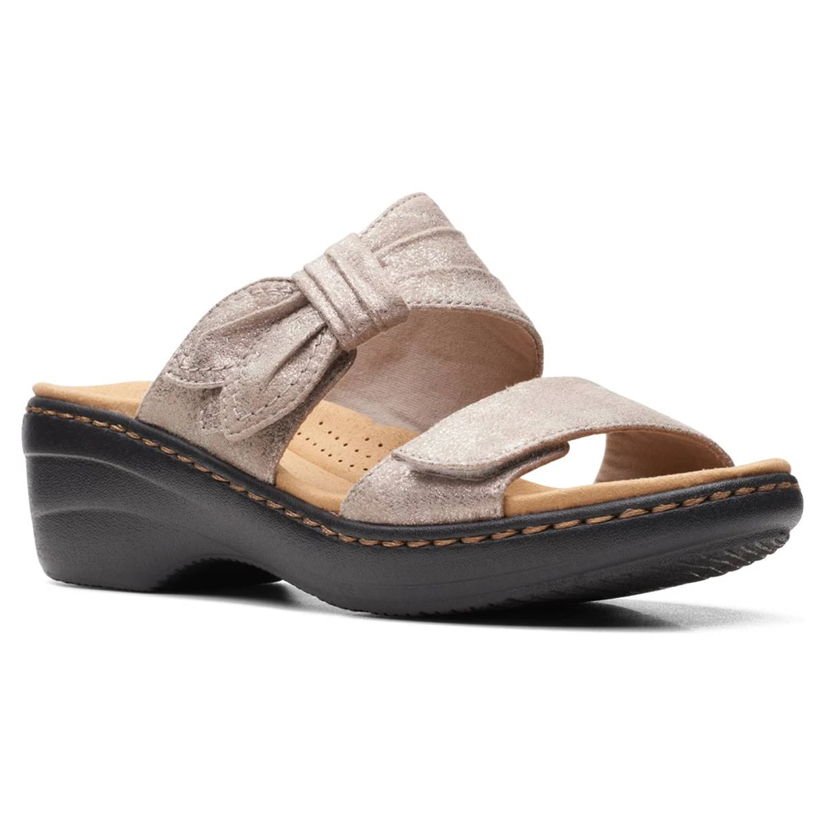 Step into summer with these Womens Clarks® Collections Merliah charm slide sandals. They feature molded cushioning and arch support set on an airy sole, with a soft and adjustable flower-detail leather upper for a classic look.