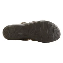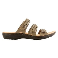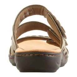 The Womens Clarks® Laurie Ann Bella olive slide sandals are the essential go to for comfort and style. Leather upper in a casual silhouette with stitched front for easy on/off, padded footbed, and adjustable velcro closures offer all day support. A breathable textile lining helps keep your feet cooler.