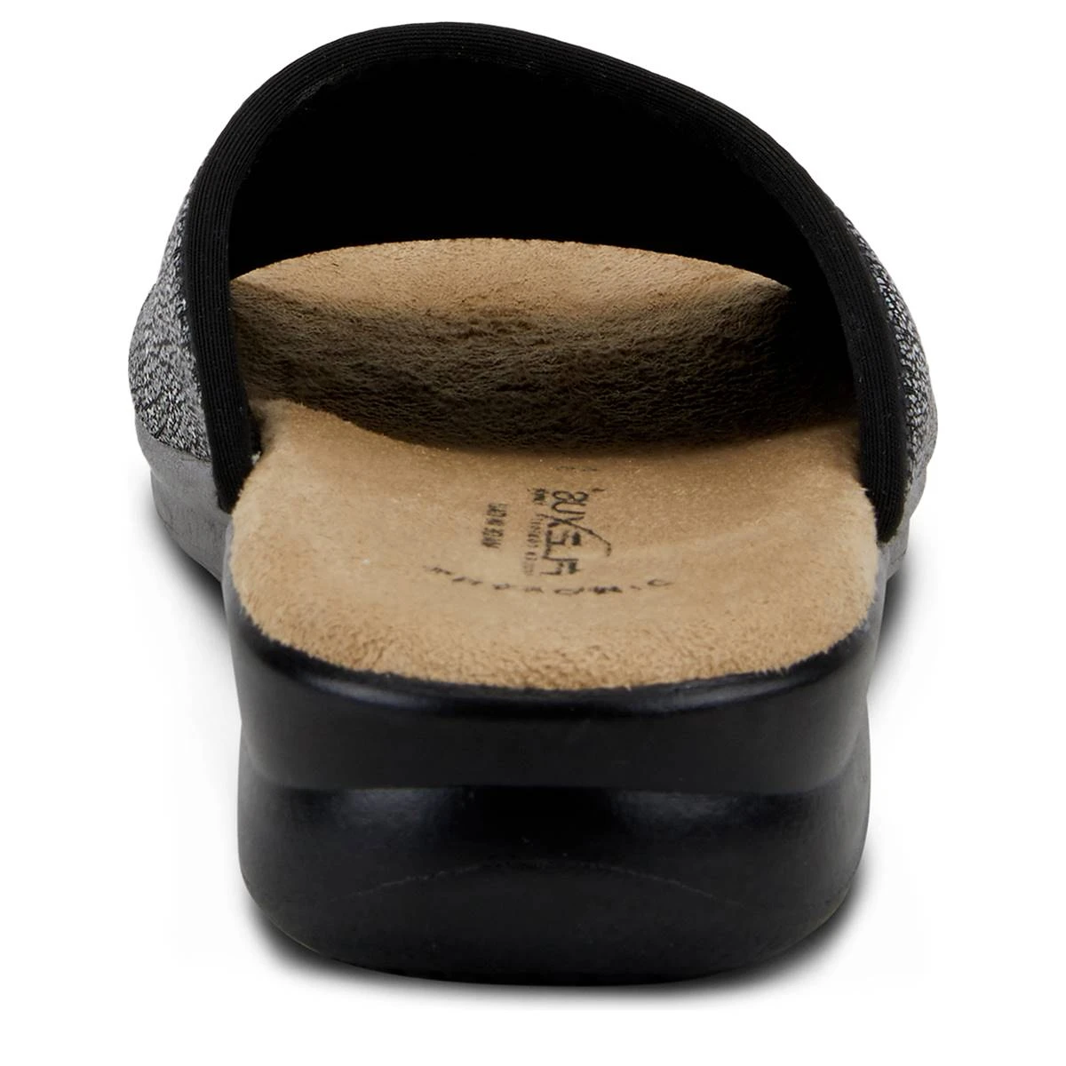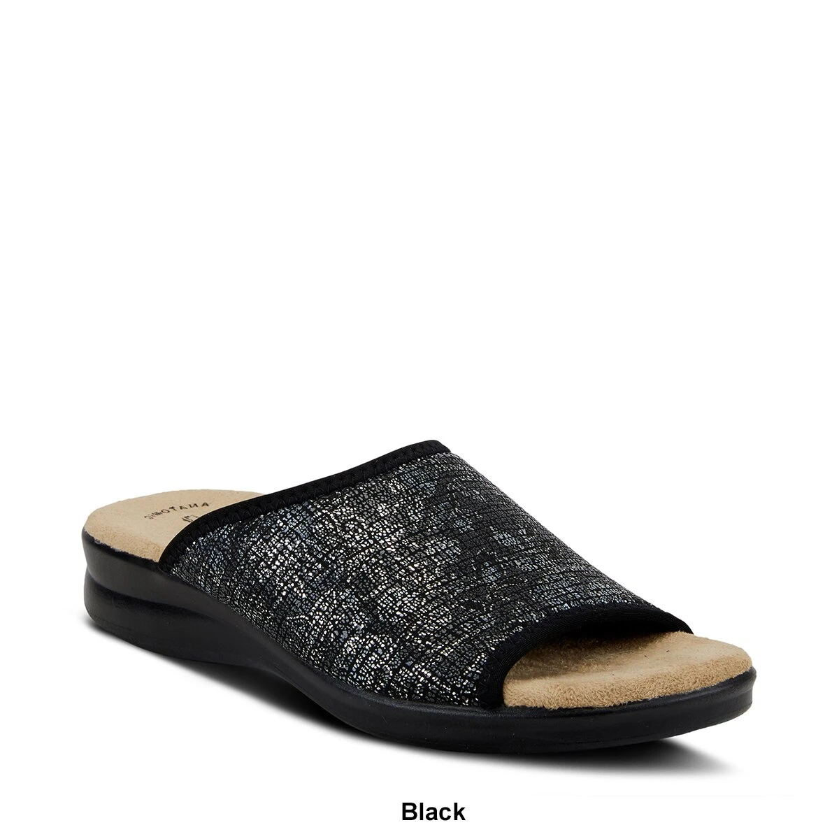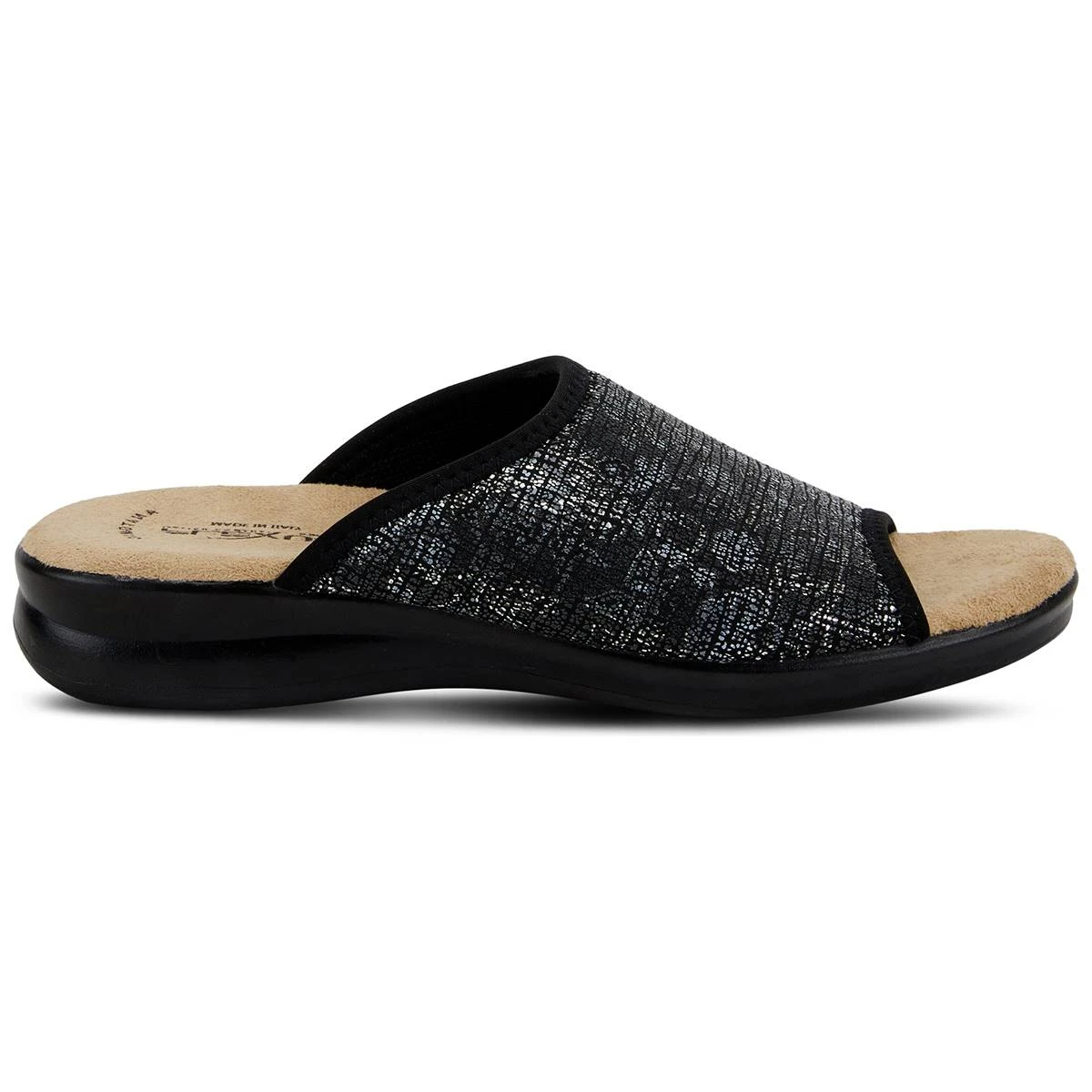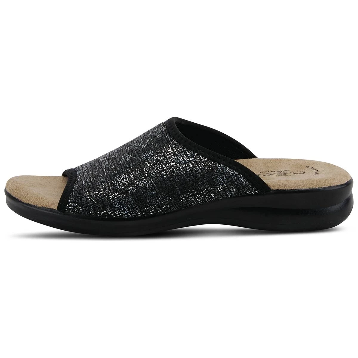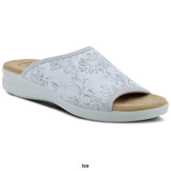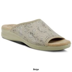 The Womens Flexus® By Spring Step Nyaman slide sandals have a textile and lycra upper with a PU outsole. These sandals are printed on a two-tone design and feature a comfortable padded footbed.