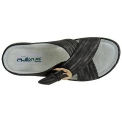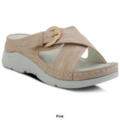 The Womens Flexus® By Spring Step Persemia slide sandals have a synthetic upper with a PU outsole. The fashionable lightweight sandals have large cross straps, featuring two-tone textured and embossed upper with shiny adjustable buckle, and all on a full length padded footbed.