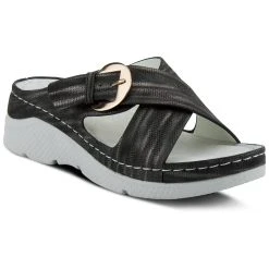 The Womens Flexus® By Spring Step Persemia slide sandals have a synthetic upper with a PU outsole. The fashionable lightweight sandals have large cross straps, featuring two-tone textured and embossed upper with shiny adjustable buckle, and all on a full length padded footbed.