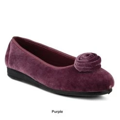 The Womens Flexus® By Spring Step Roseloud slip-on ballet slippers are great for both indoors and outdoors. They showcase textile uppers with a soft rose detail. These adorable slippers feature soft textile lining, comfort padded textile insoles, and rubber outsoles.
