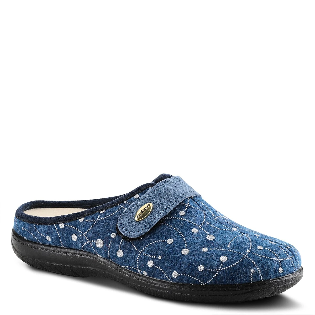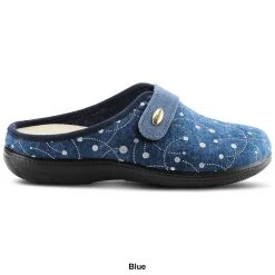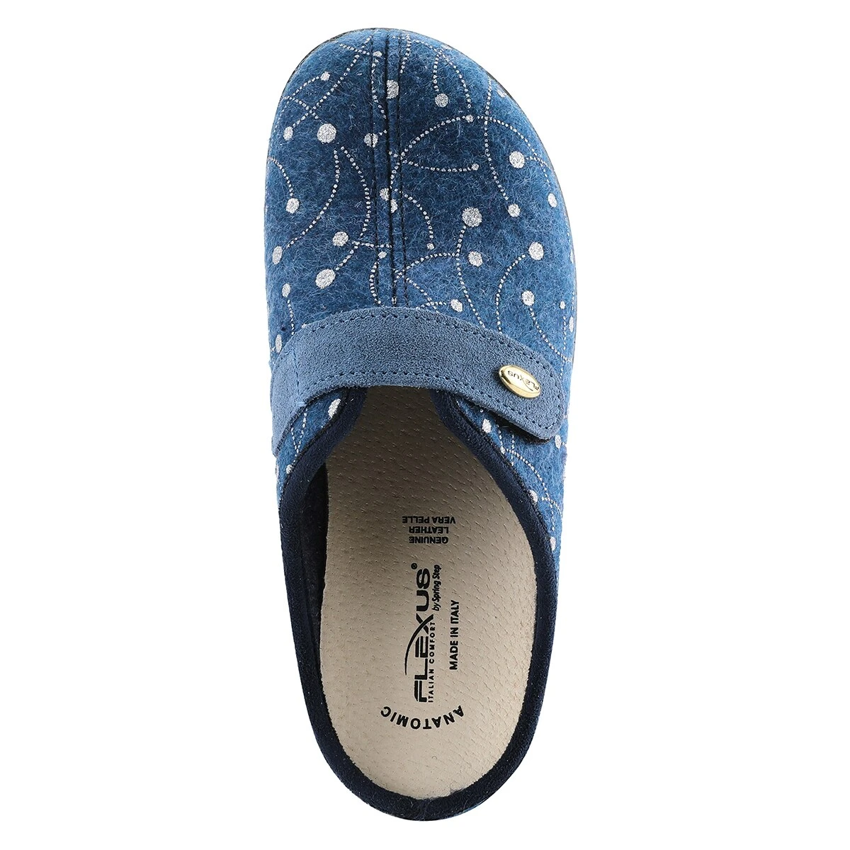 These Womens Flexus by Spring Step Sophie slippers feature indoor and outdoor style. With a beautiful curve metallic dot design, leather insole, and an adjustable hook and loop top strap on an all-day-wear outsole.