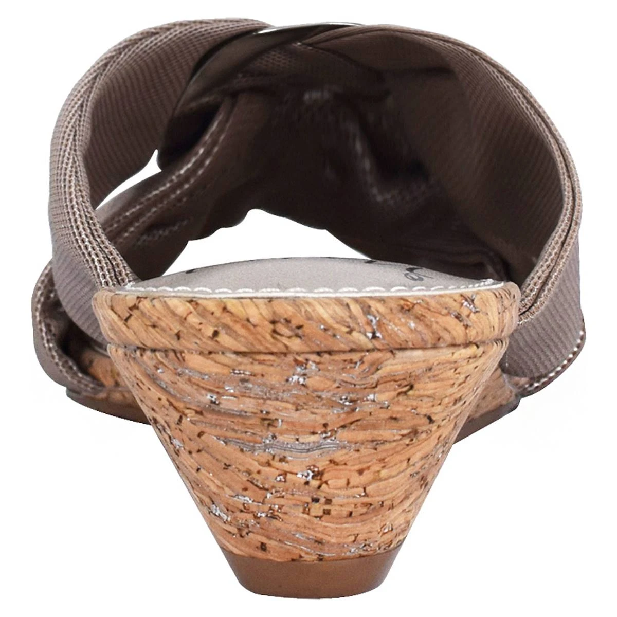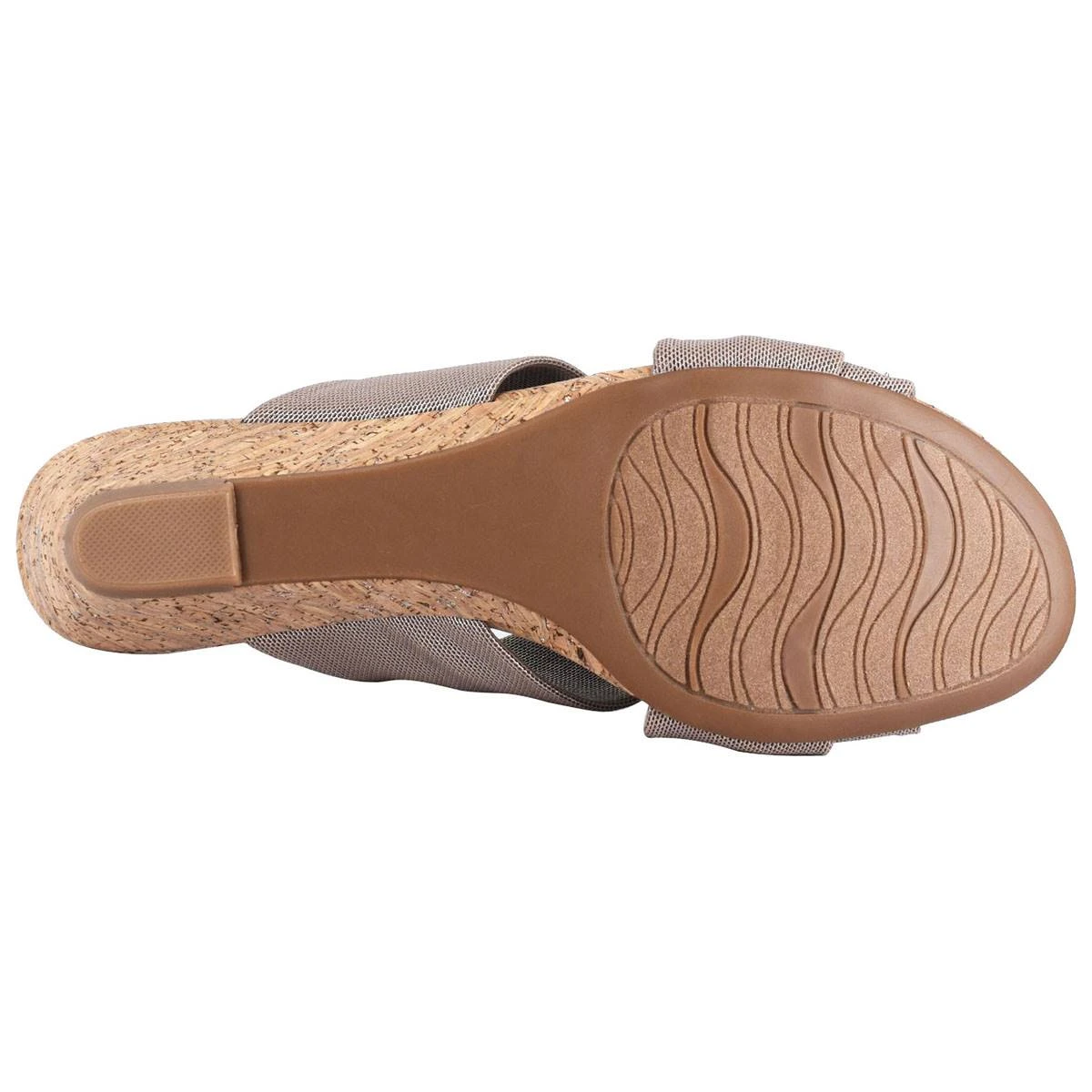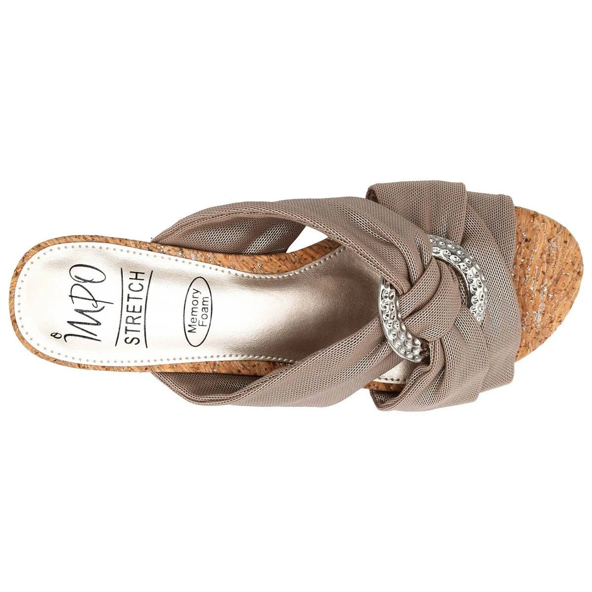 Slip on these Womens Impo Rexine Wedge Slide Sandals that reflect the comfort and ease so desired in today’s fashion world. These power mesh slides are defined by their soft tubular bands, round hammered ornament, a soft cushioned memory foam footbed, and a natural cork-covered wedge.