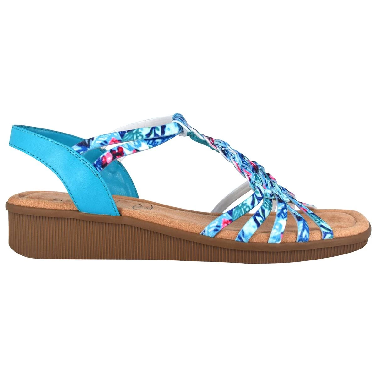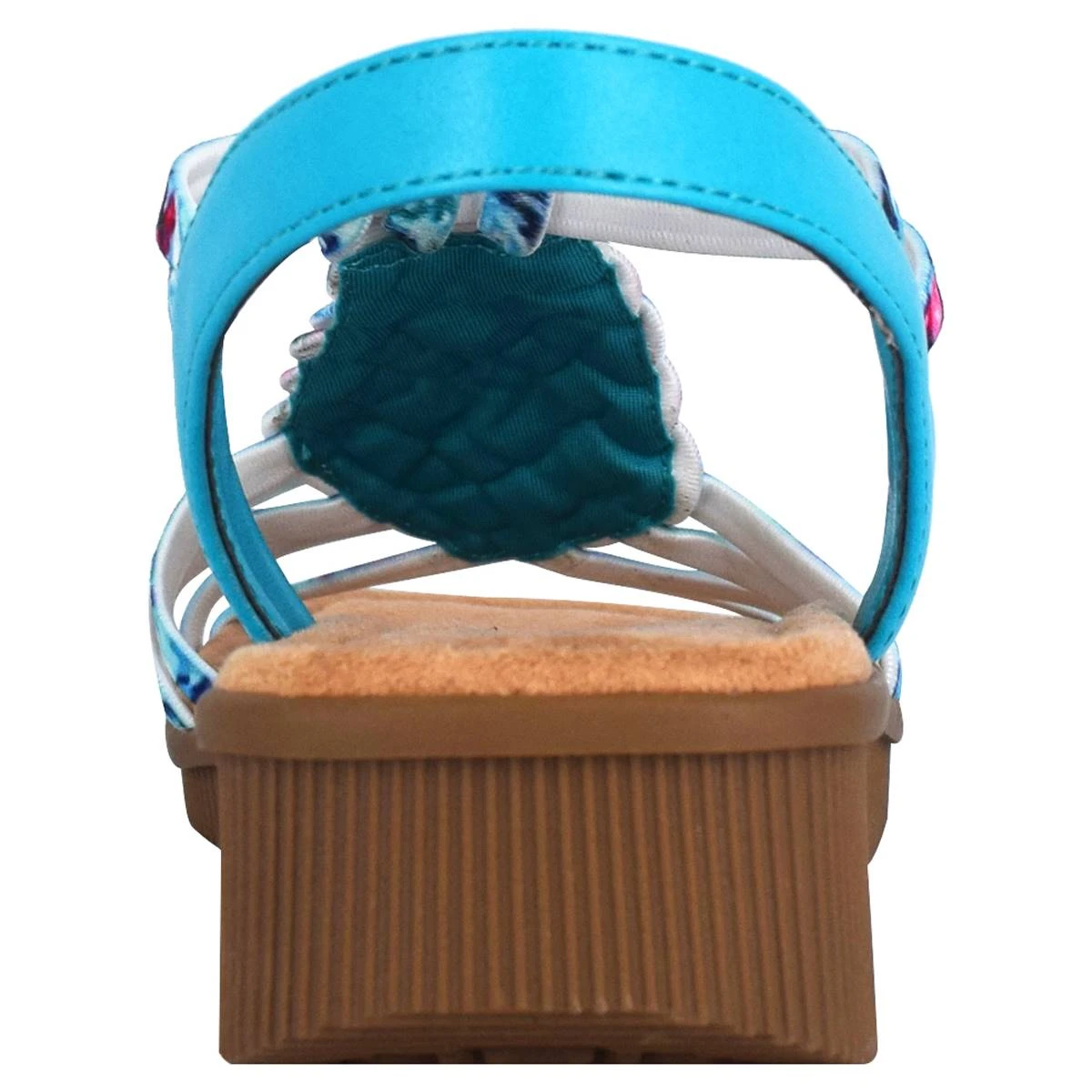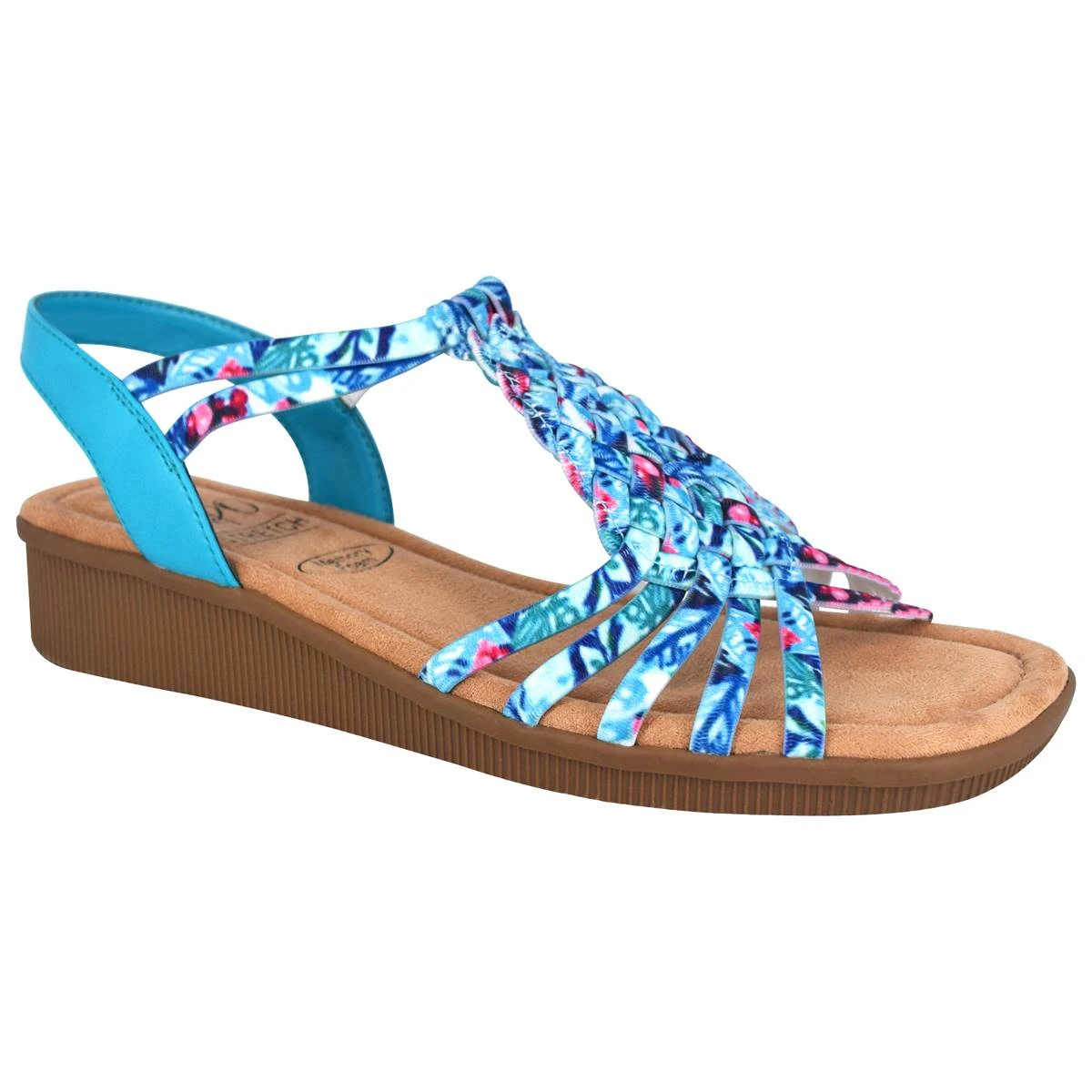 For an elevated leisure-wear style that offers comfort and stretch, slip-on these Womens Impo Rosette stretch tropical strappy sandals. The sandal features a braided stretch elastic upper, a trendy square toe and heel, a softly padded memory foam footbed, and a new ribbed rubber unit bottom.