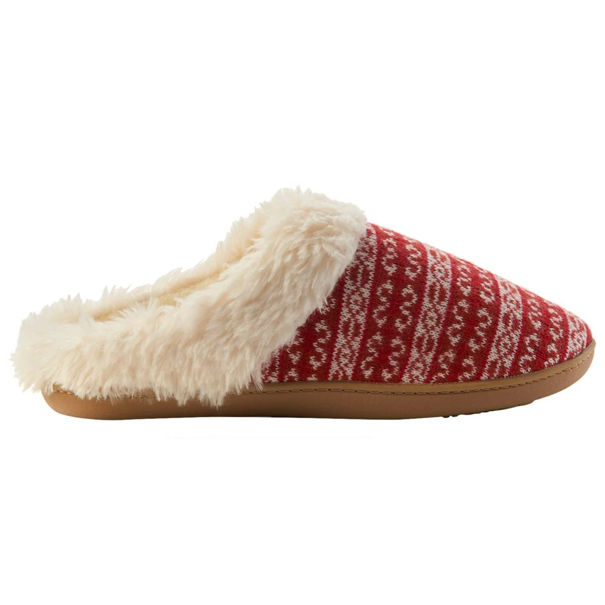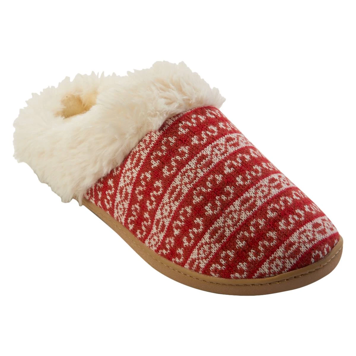 These Womens Isotoner fair isle brae hoodback slippers combine cozy with a luxurious soft Sherpa cuff for superior comfort. Lined with a super soft fleece these slippers are the perfect pair for relaxing with a latte or running light errands. Classic hoodback style slips on and off for on-the-go convenience.