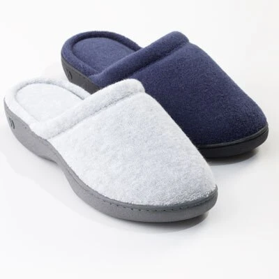 The secret to comfort! These Womens terry slip on slippers feature the Isotoner Secret Sole to cradle your heals and support your arches. The perfect way to sooth and relax your tired feet. Indoor/outdoor soles. Machine wash.