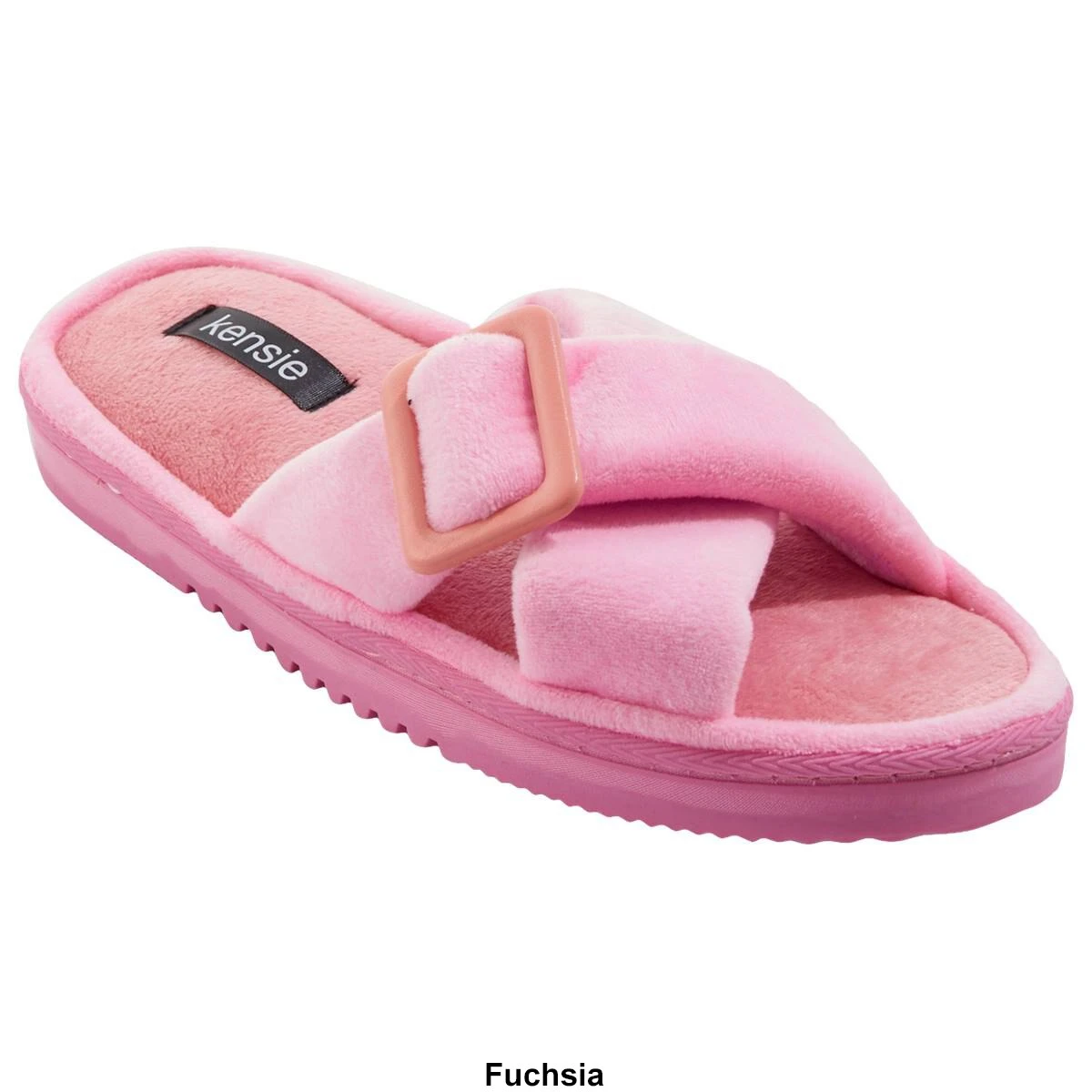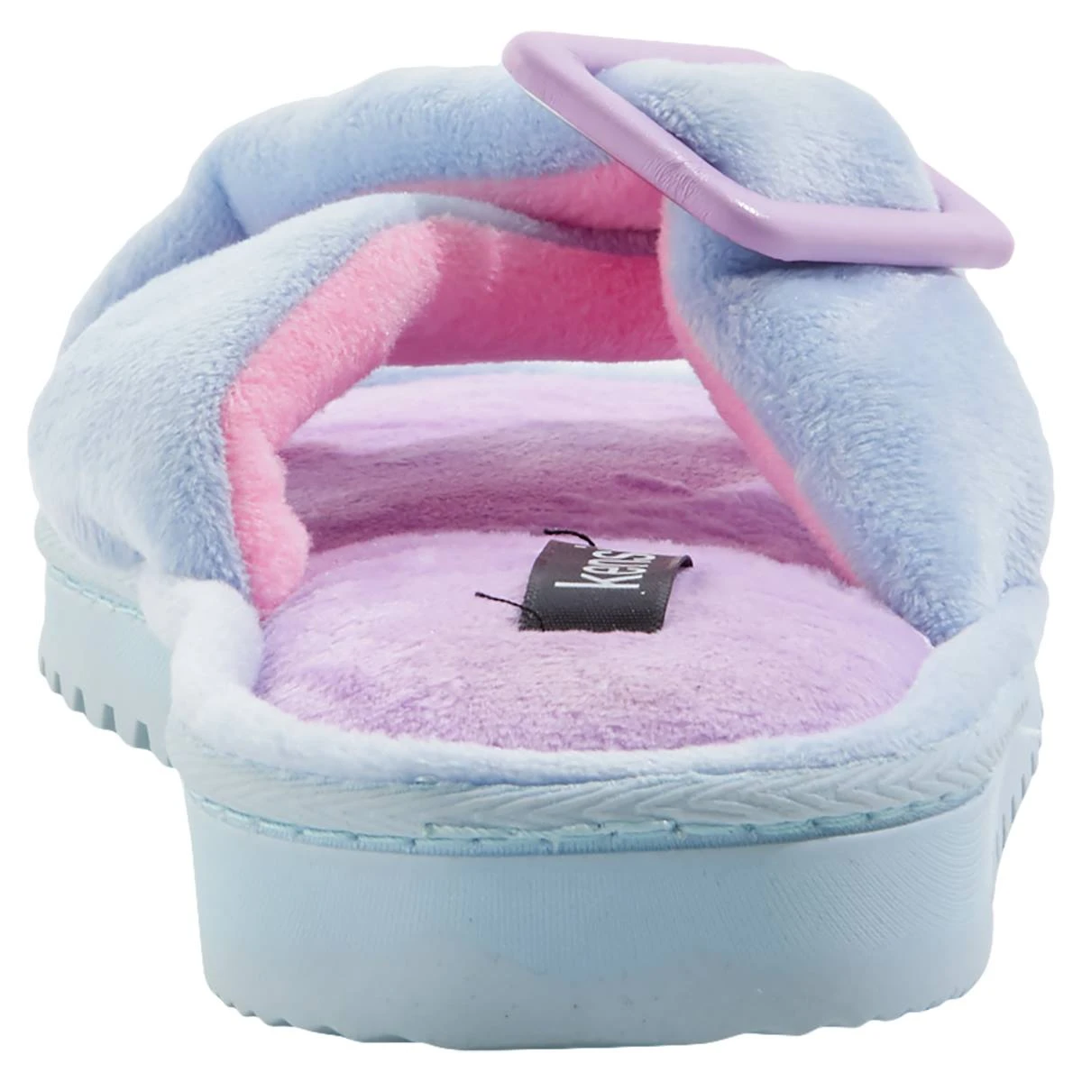 Stay stylish while relaxing with the Womens Kensie X slide slippers with buckle. These unique slippers will keep you comfortable with the cushioned memory foam insole.
