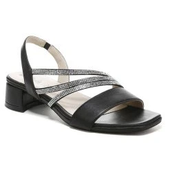 It’s your time to shine. Elevate your evening wear with these Womens LifeStride rhinestone-accented dress strappy sandals. Faux leather upper with a square toe, heel sling strap with stretch gore panel, and rhinestone-accented straps. Insole board partially crafted with recycled materials. Soft System® comfort package provides all-day support, flex, and cushioning. Secret Cushion™ insole with a hidden full-length cushioned footbed for 24/7 heel-to-toe comfort. Just Right Height 1 and 1/4 inch block heel.