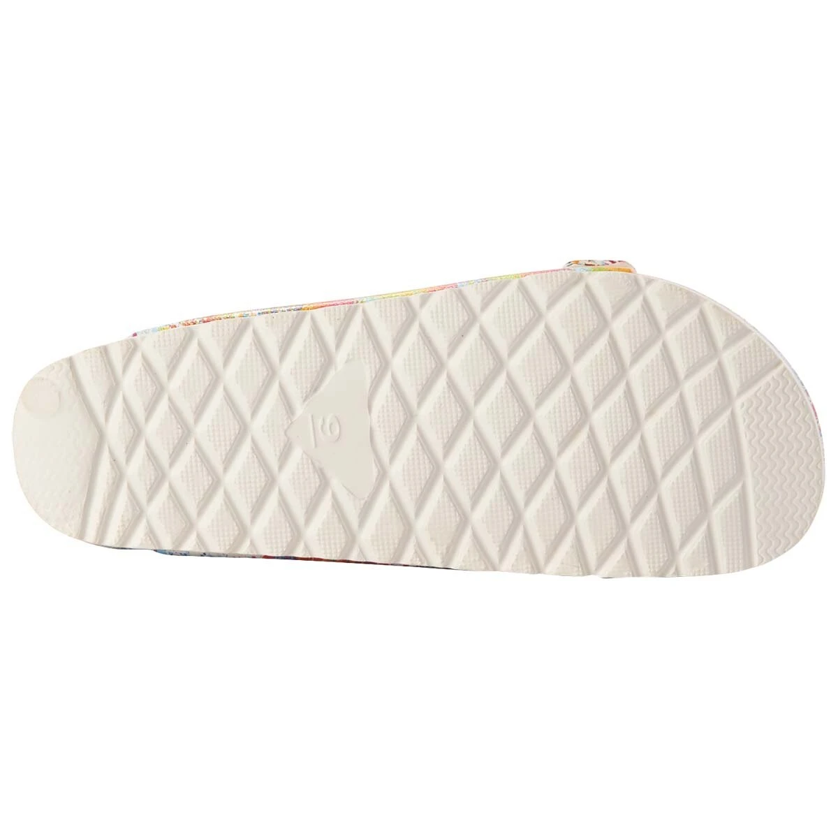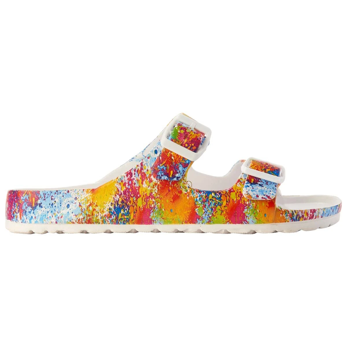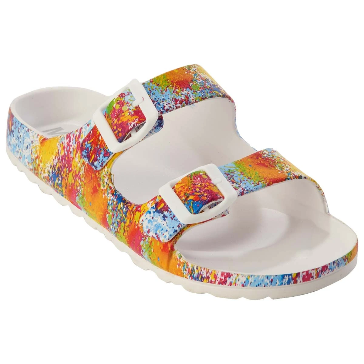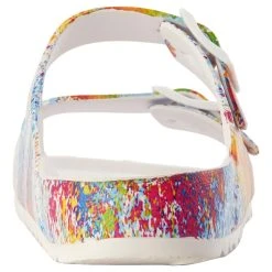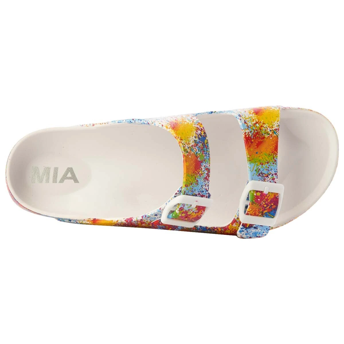 Make looking and feeling great a simple task in these Womens Mia Jasmin splatter slide sandals. This slip on style offers dual buckled straps, a traction outsole, and an open-toe design.