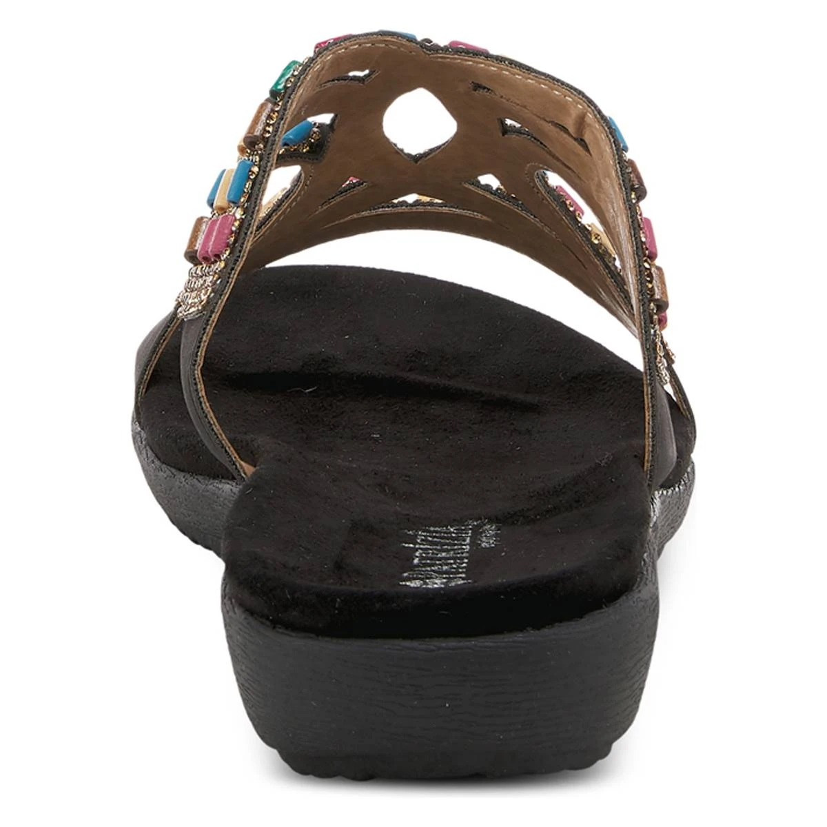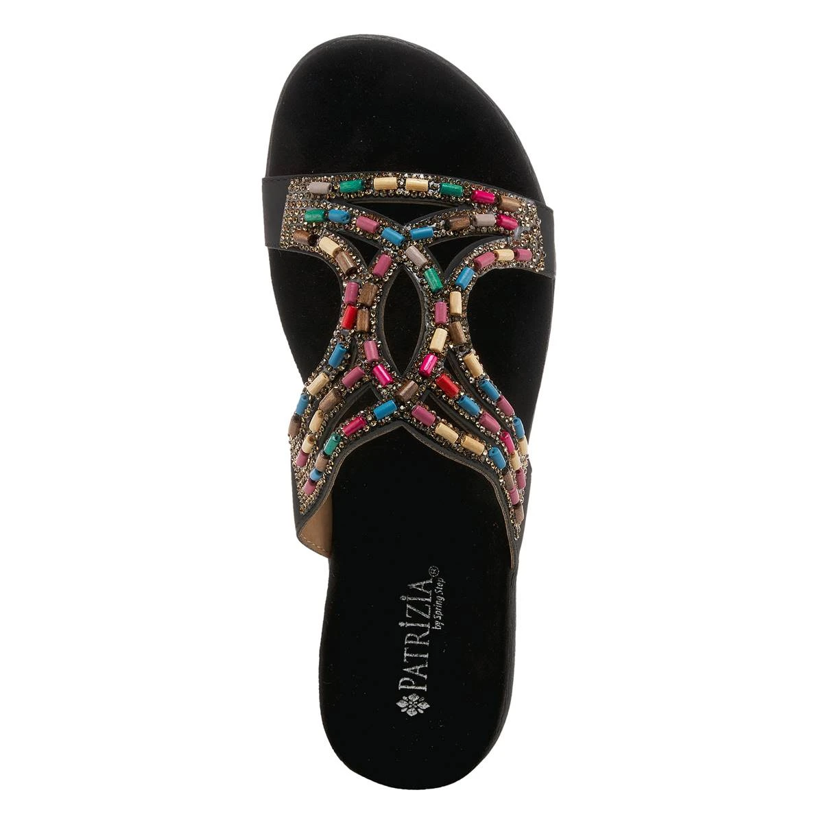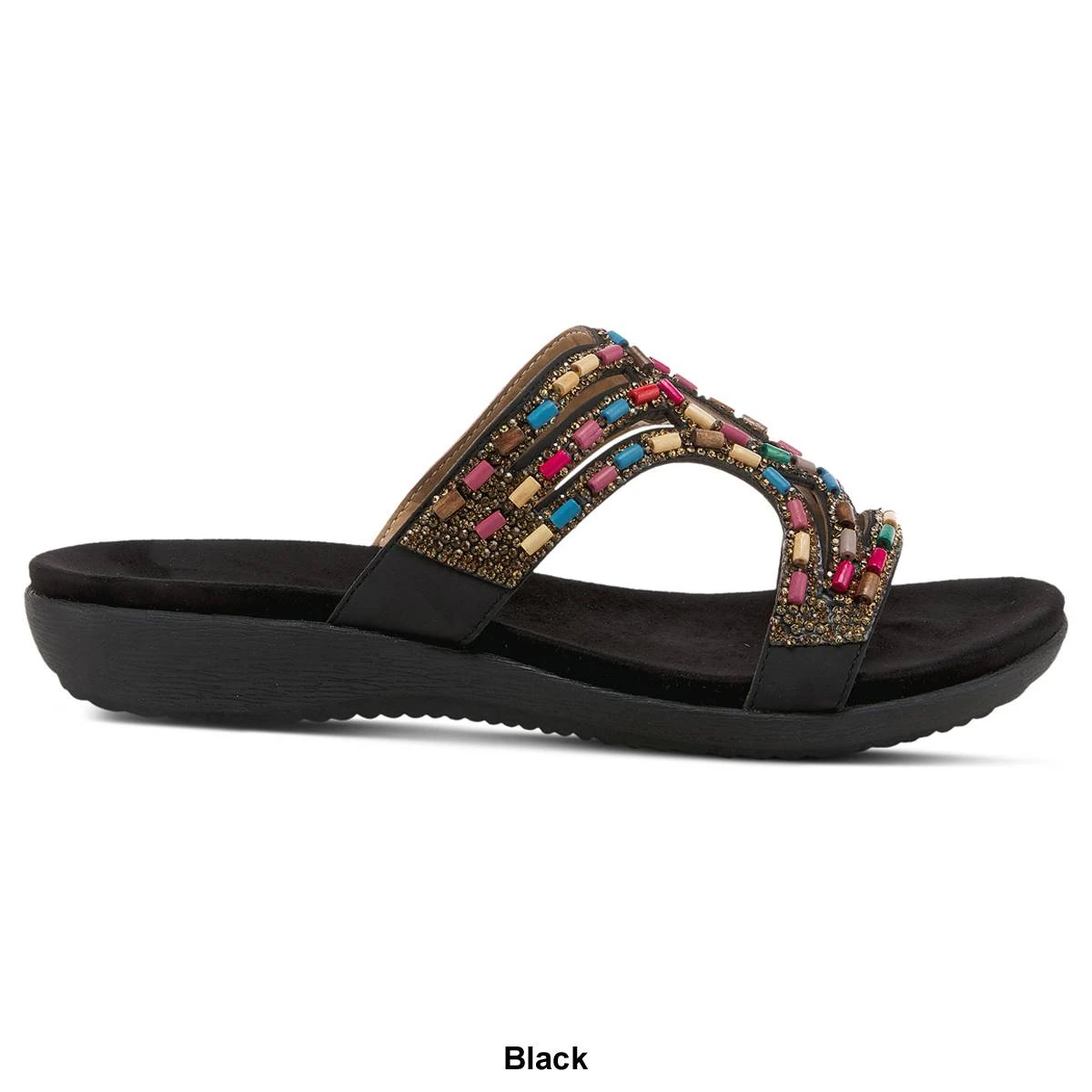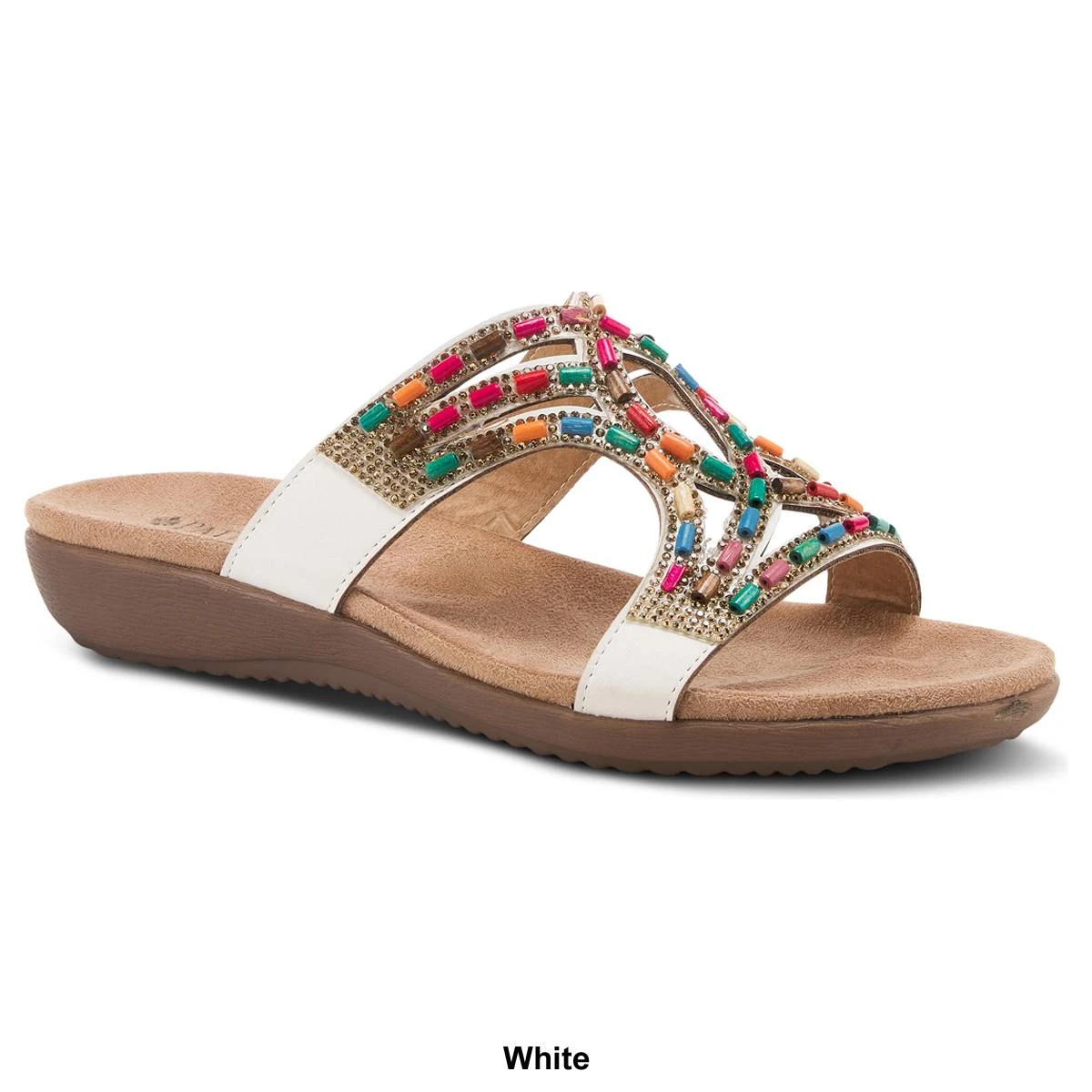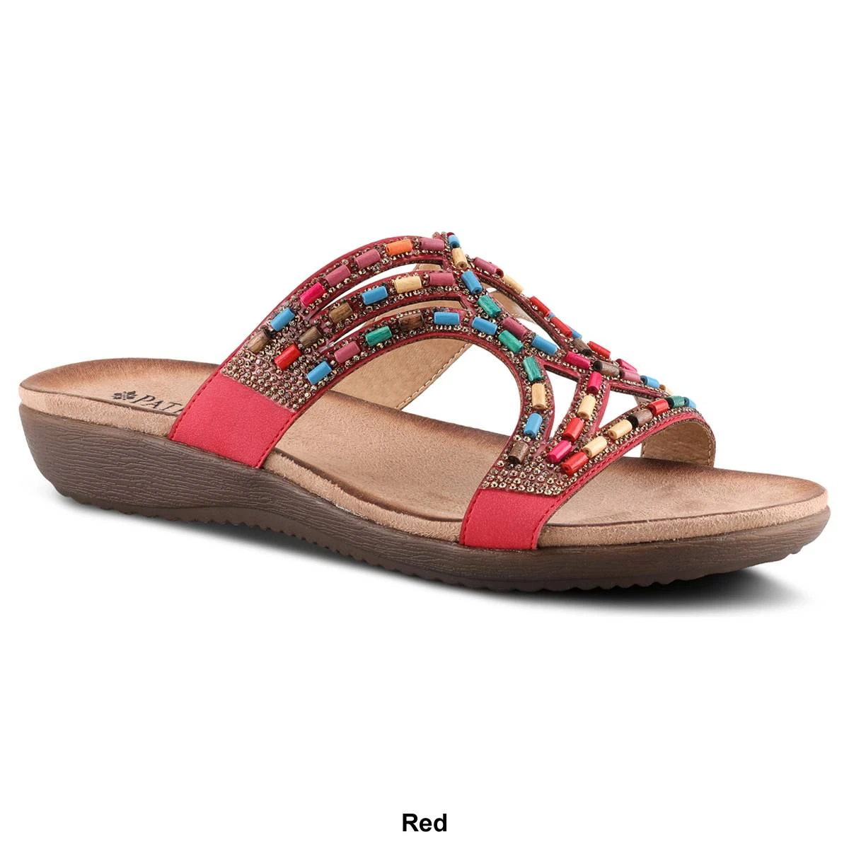 Once you slide your foot into these Womens Patrizia Twirling Slide Sandals, you’ll never want to take them off! Your foot will be cradled and nestled into what is sure to be your favorite summer go-to sandal featuring a flexible contoured wedge, and an upper of alternating, shimmering crystals and rainbow wooden beads.