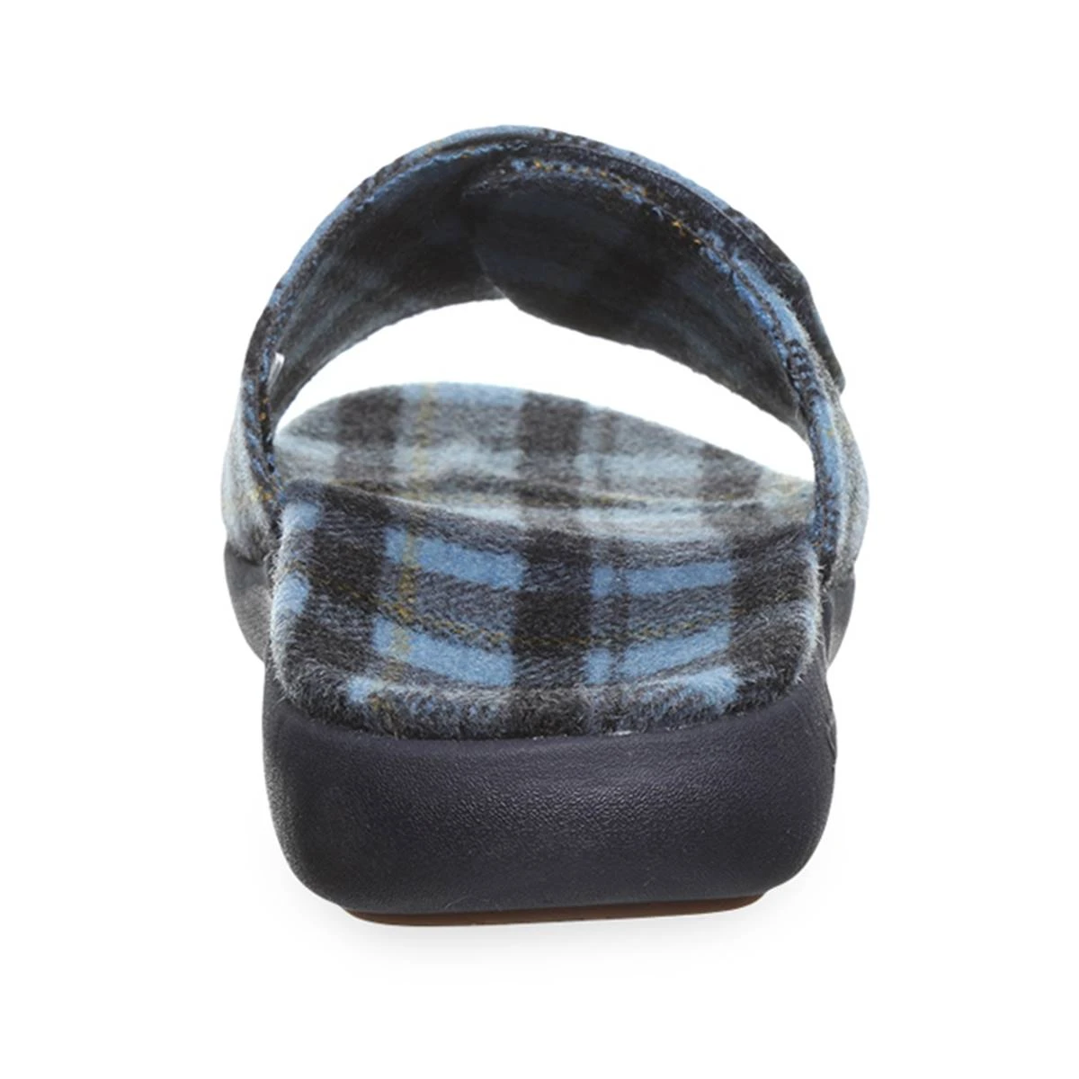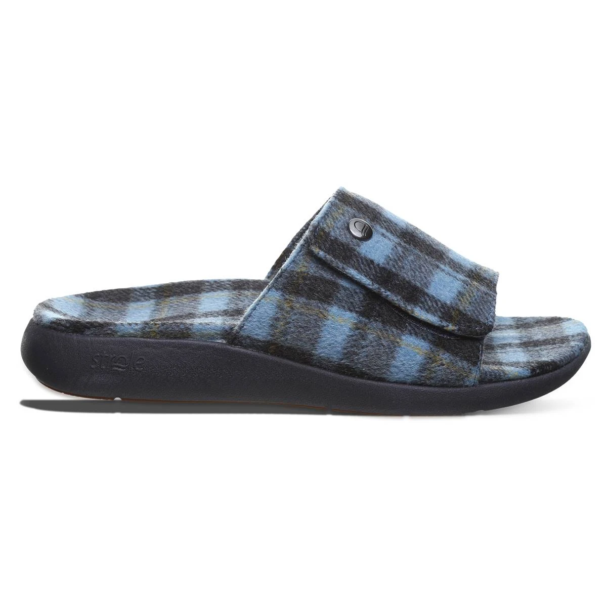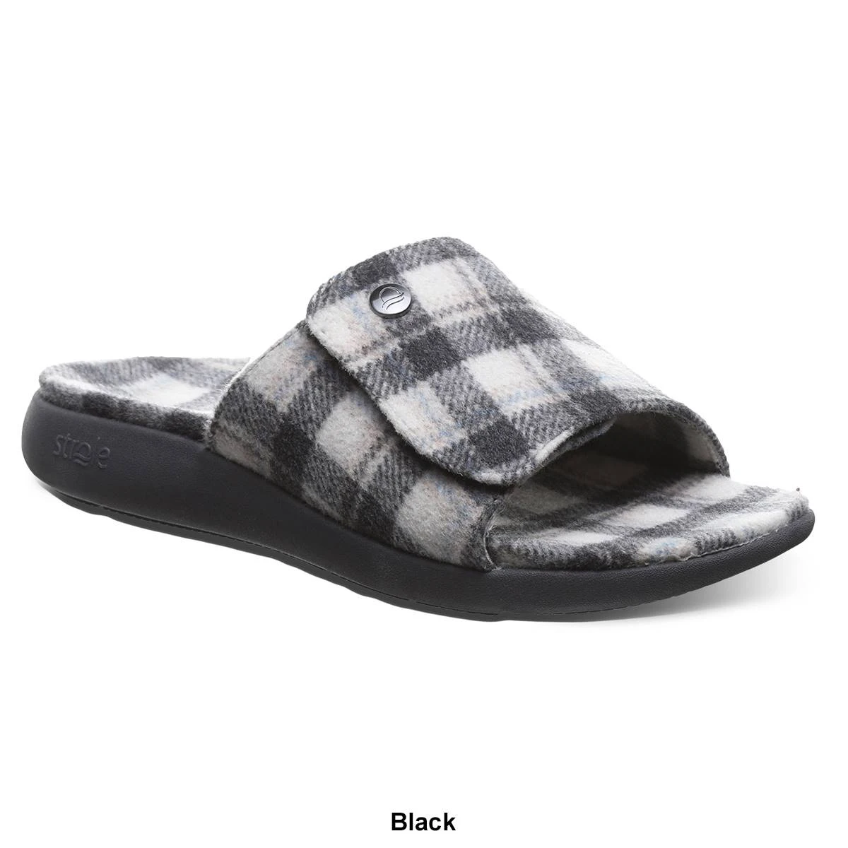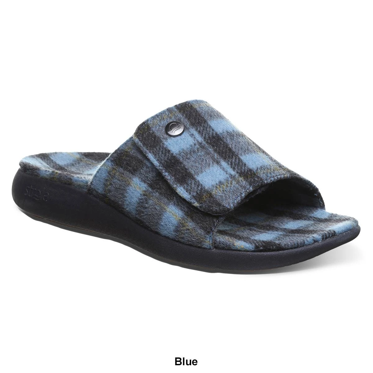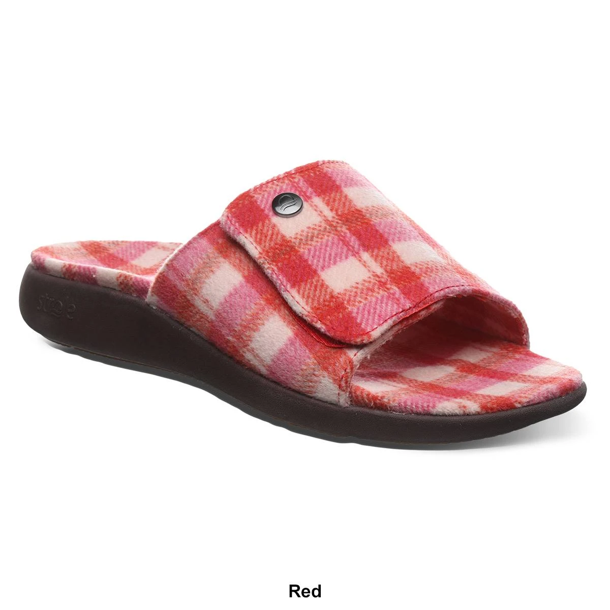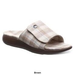 These Womens Strole Den Tartan Open-Toe Slippers are perfect for healthy walking and a healthy lifestyle. Features arch support for body alignment, rebound cushioning, and adjustable velcro strap.