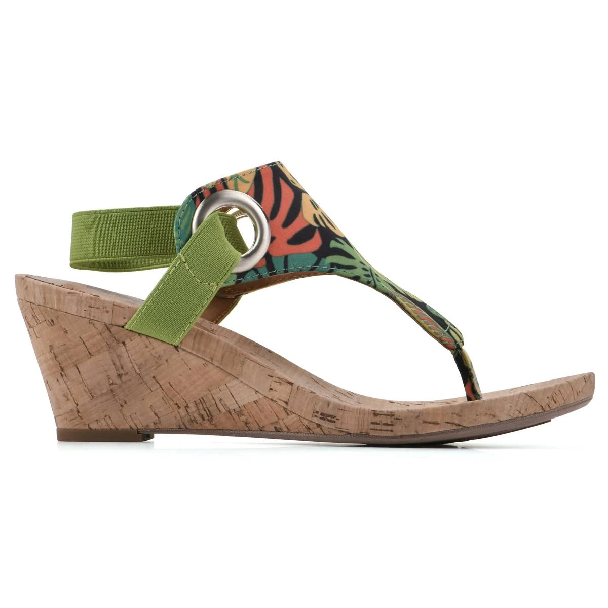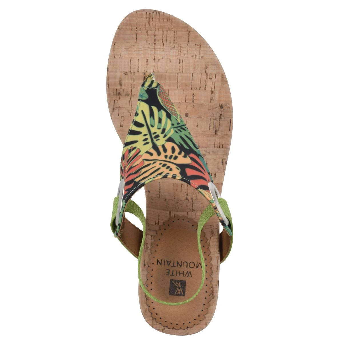 The Womens White Mountain Aida tropical wedge sandals are versatile and perfect for a night out or brunch. Gives any outfit an automatic POP of fashion. Features a cork footbed, elastic strap closure, and grommet details.