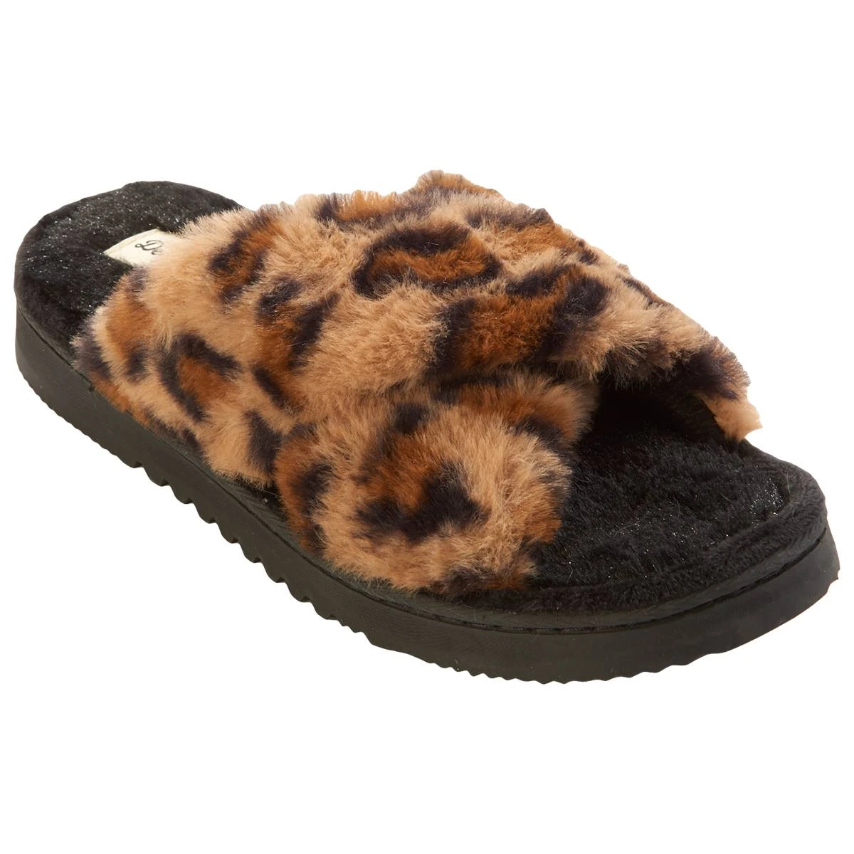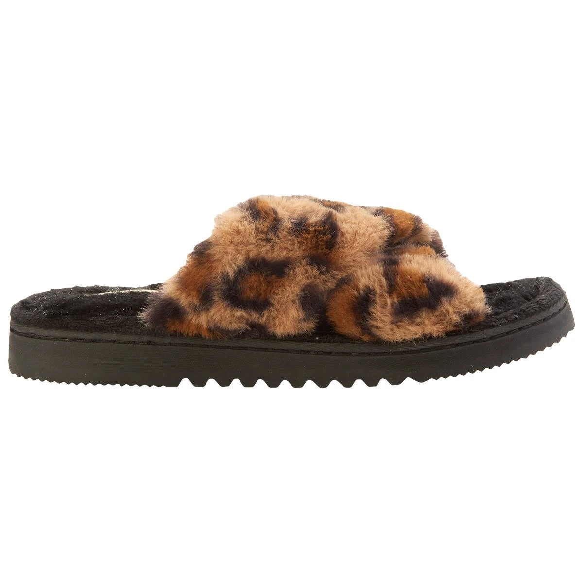 Enjoy the soft feel of the Womens Dearfoams® crossband slide slippers. The adapt technology will keep you cool and dry all day long. Featured are plush lining and memory foam insoles.