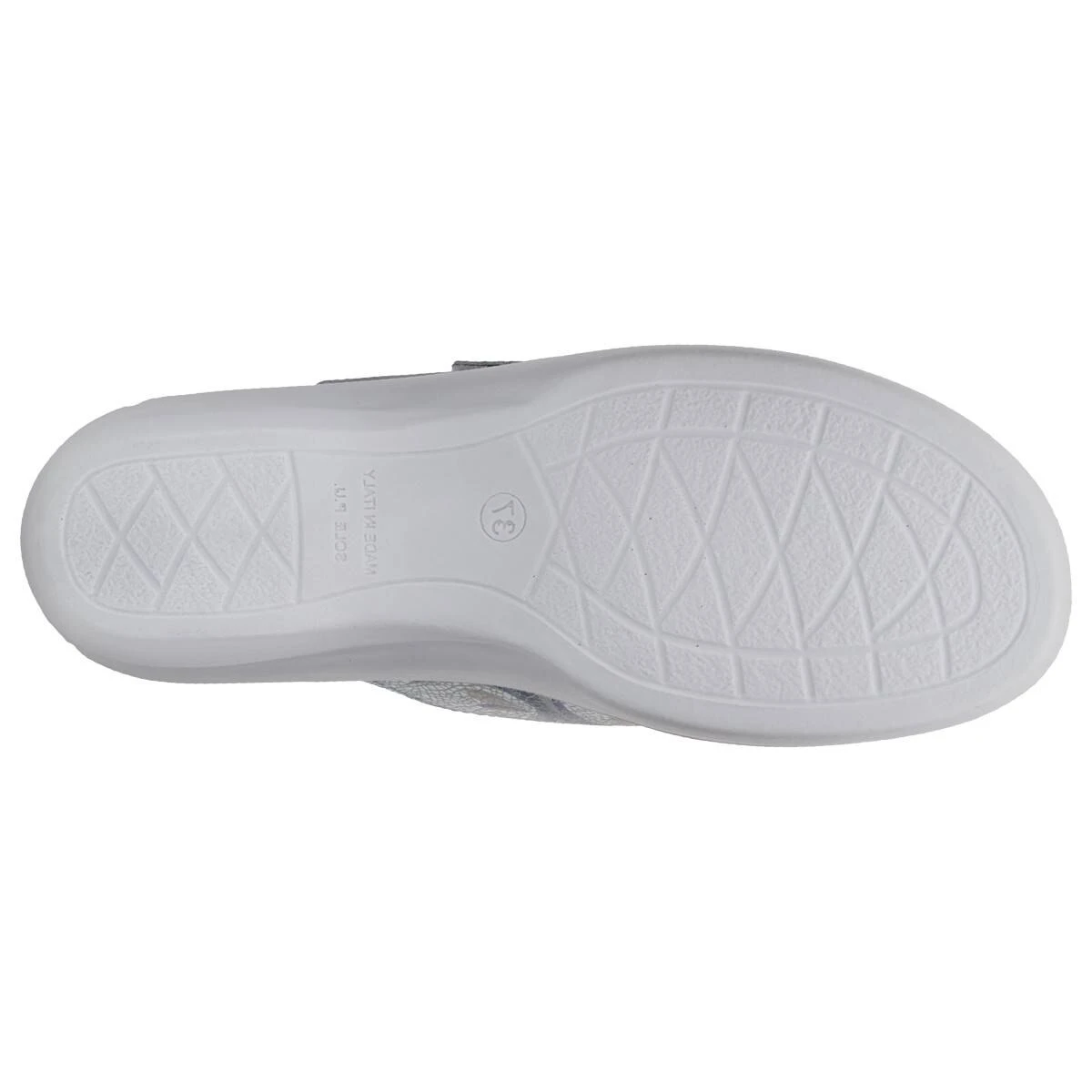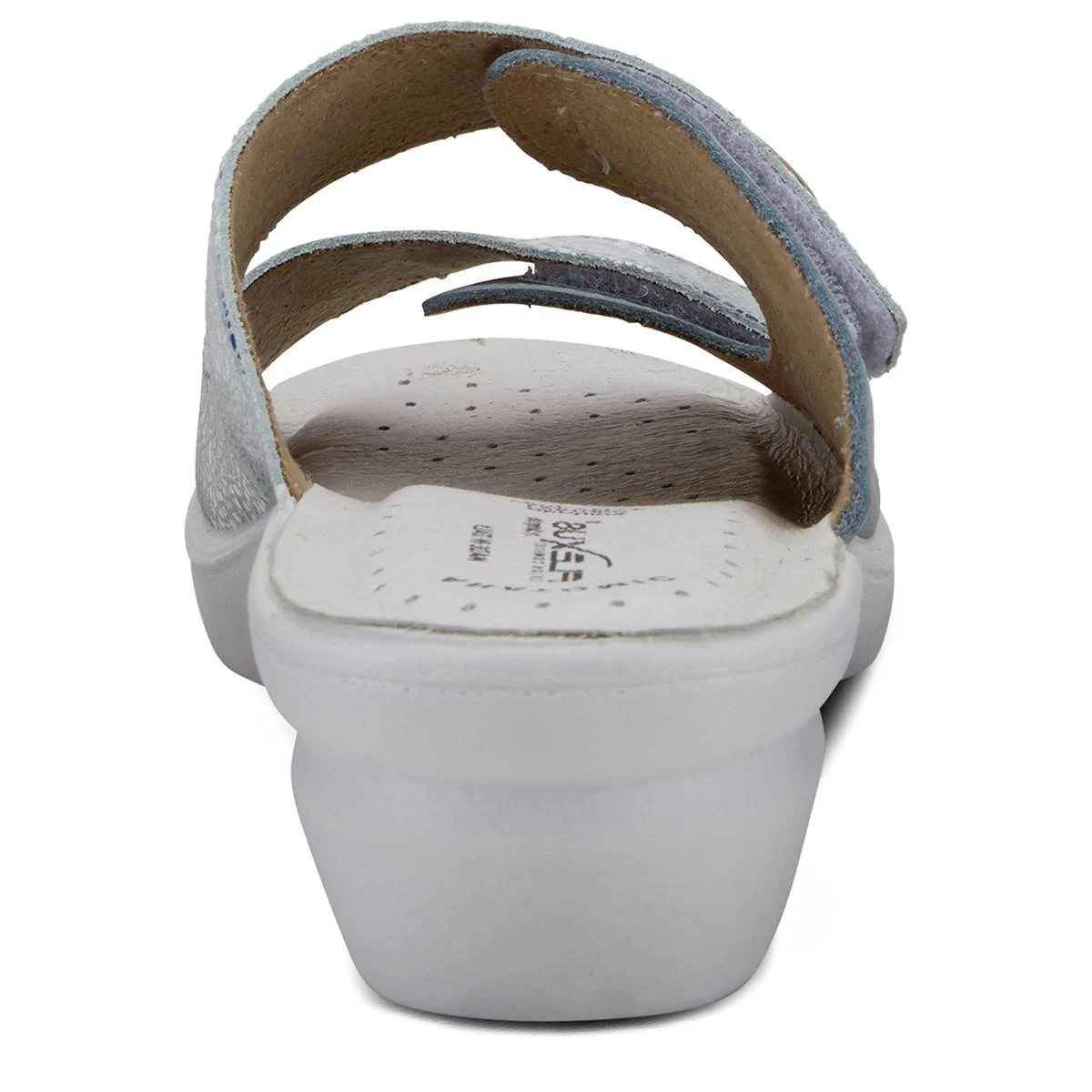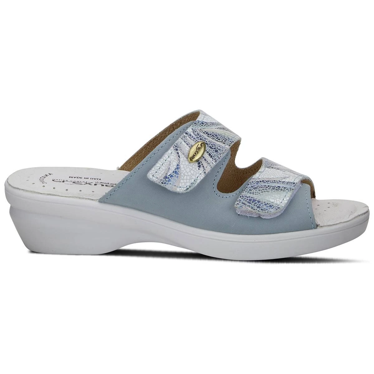 The Womens Flexus® By Spring Step Kina Slide Sandals have a suede upper with a polyurethane outsole. These sandals feature a printed multi-colored design with a hook and loop adjustable strap.