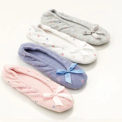 Delicately detailed Womens stretch terry ballet slippers surround your foot with comfortable and custom fit. Suede outsole is soft, flexible and light. Machine wash.