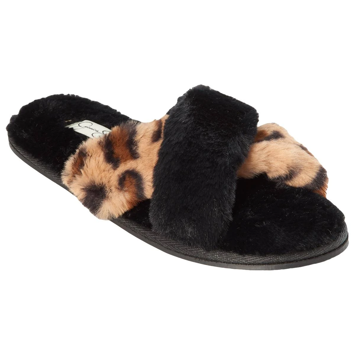 Relax in comfort and style with the Womens Jessica Simpson plush cross slide slippers. These slippers feature a crisscross band, indoor/outdoor soles, and a soft plush lining with memory foam.
